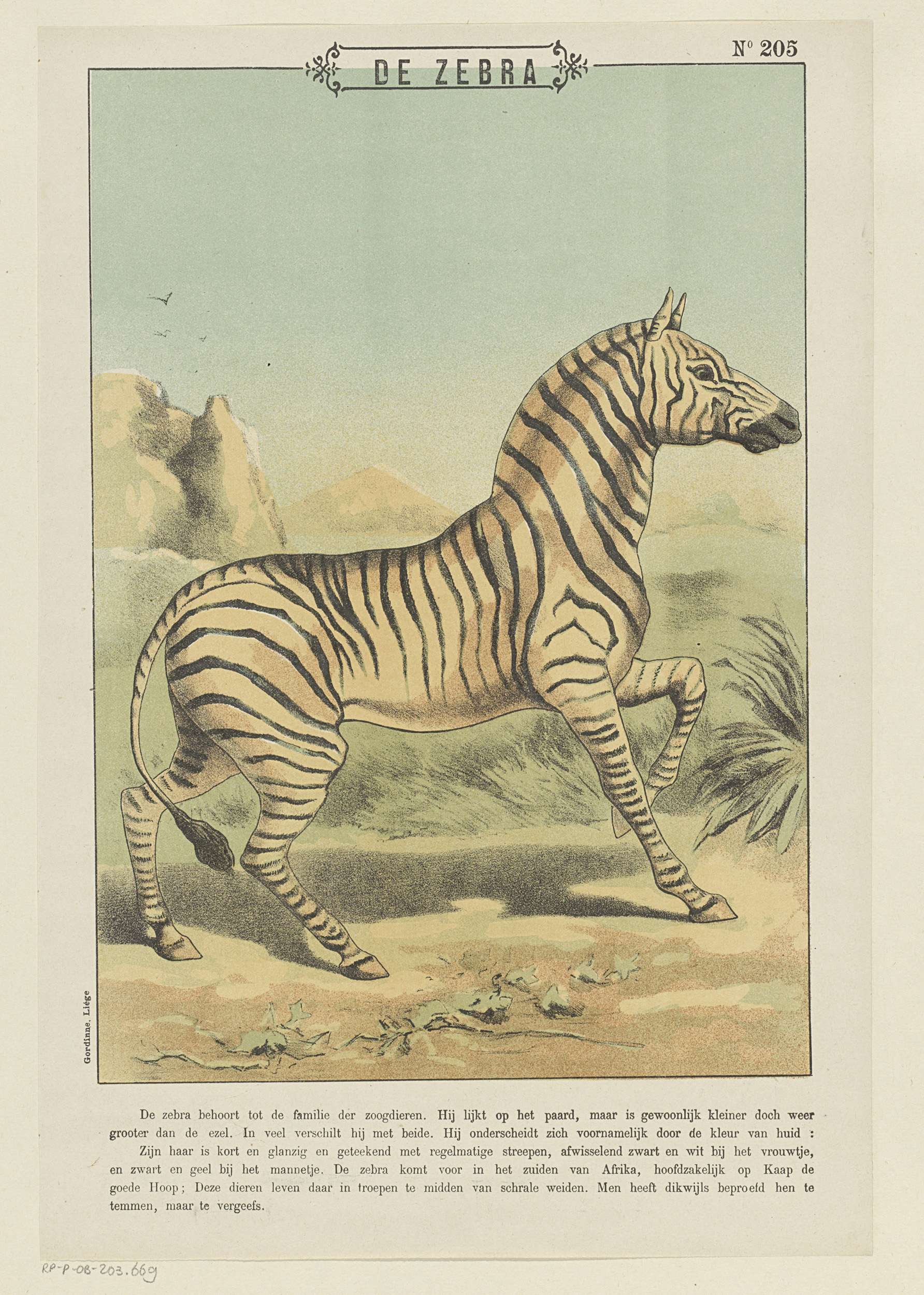Blad met een grote voorstelling van een zebra. In de ondermarge een onderschrift. Genummerd rechtsboven: No 205.