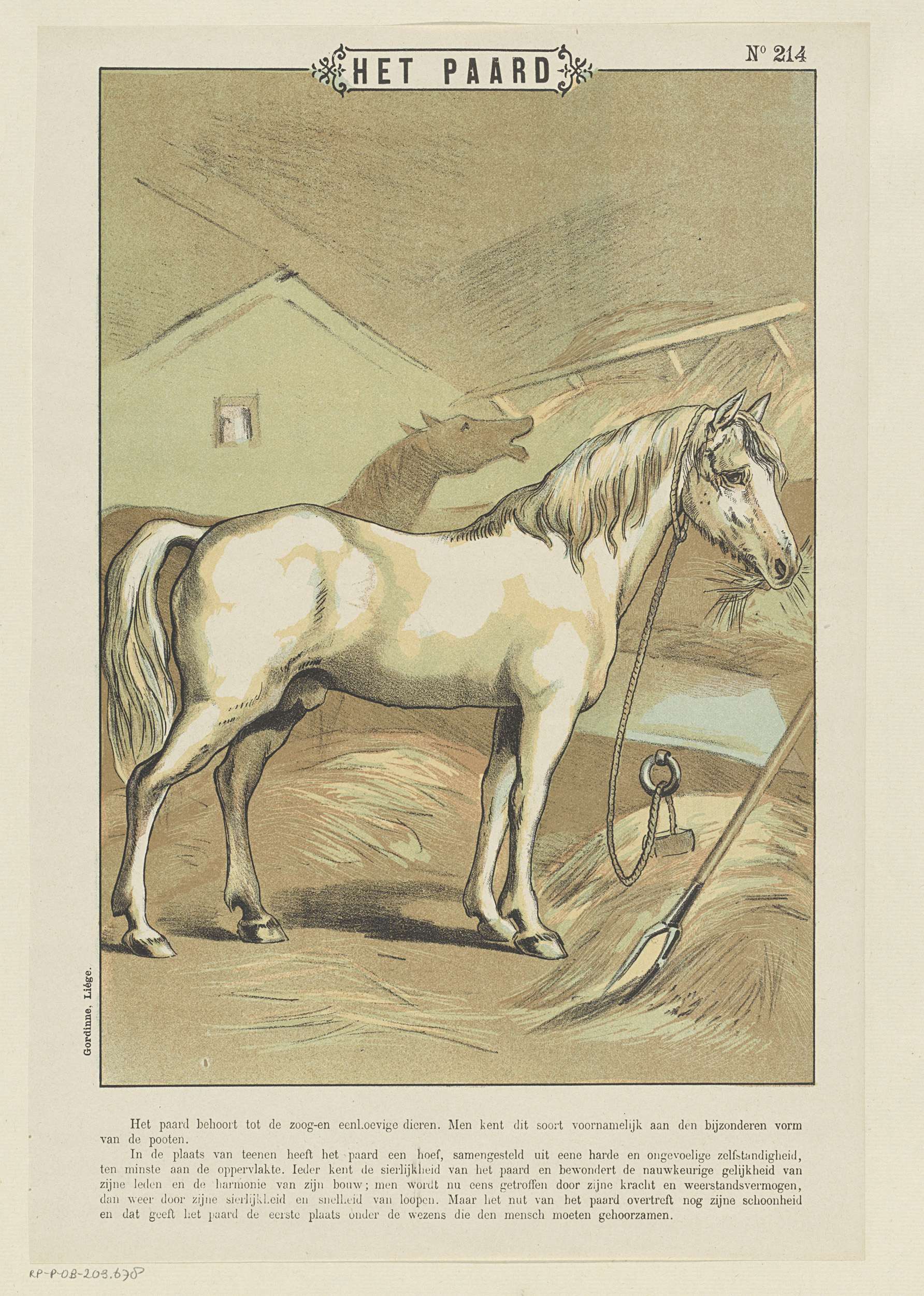 Blad met een grote voorstelling van twee paarden in een stal. In de ondermarge een onderschrift. Genummerd rechtsboven: No 214.