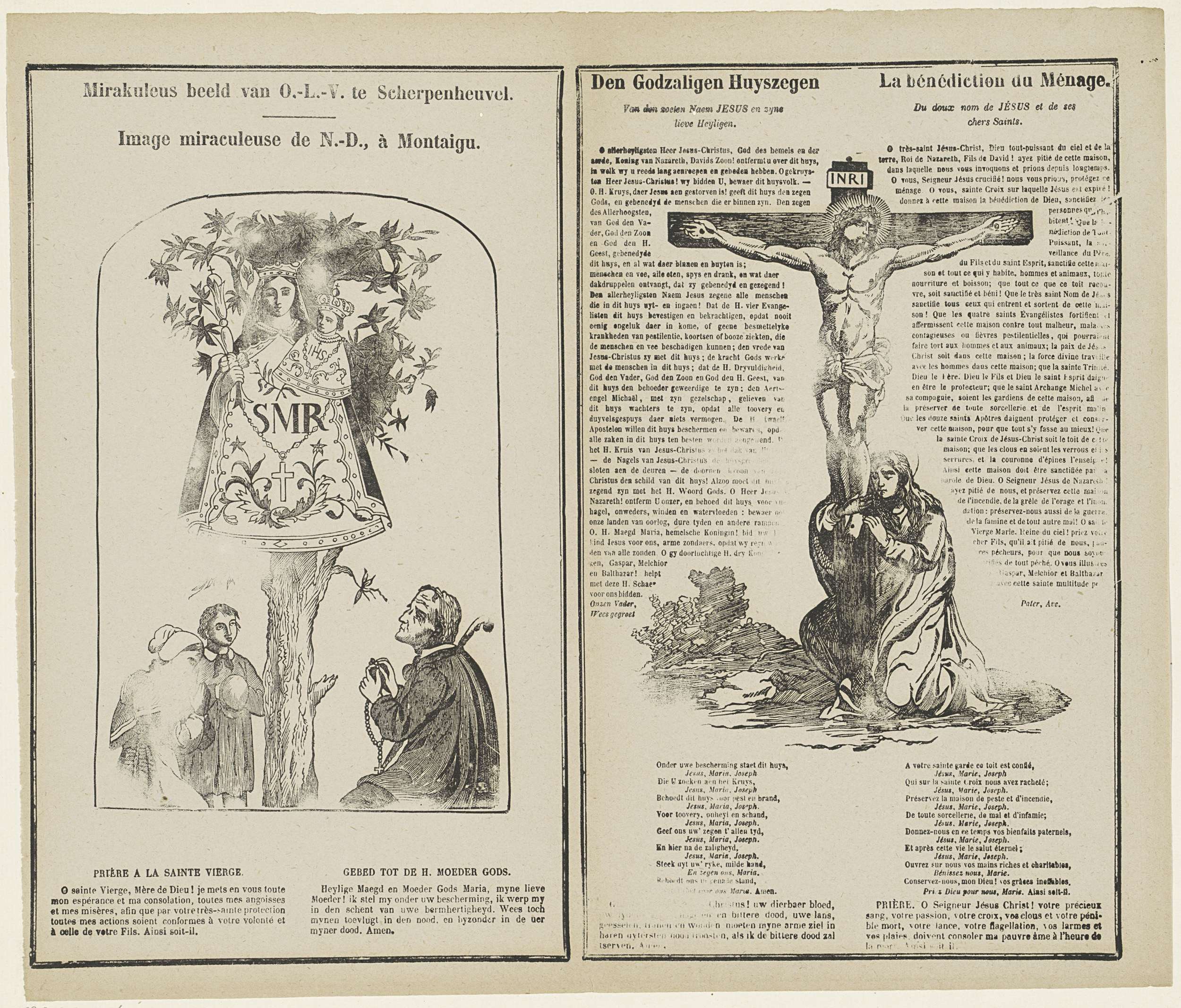 Blad met 2 voorstellingen. Links een voorstelling van de Onze-Lieve-Vrouw van Scherpenheuvel in een boom met daaronder mensen in gebed. Rechts een voorstelling van Maria Magdalena treurend aan de voeten van de gekruisigde Christus. Beide voorstellingen worden omgeven door een kader. Bij beide voorstellingen een bijschrift in het Nederlands en in het Frans.