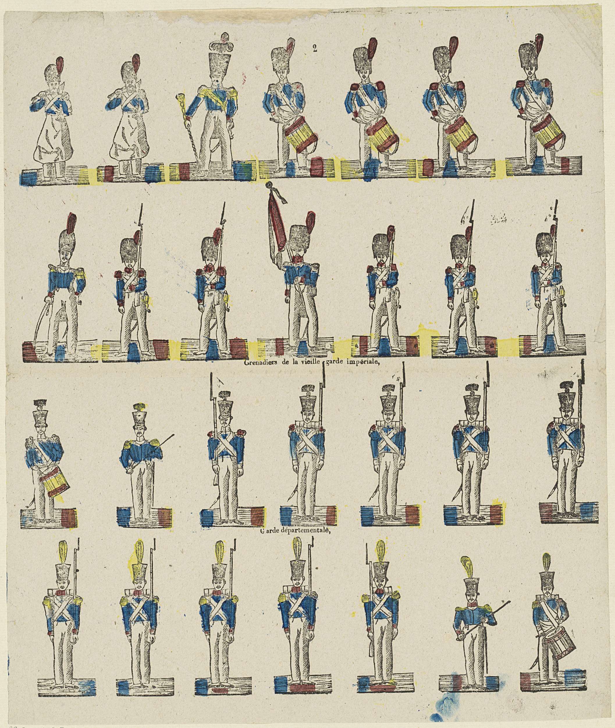 Blad met 28 voorstellingen van militairen (grenadiers). Genummerd midden boven: 2.