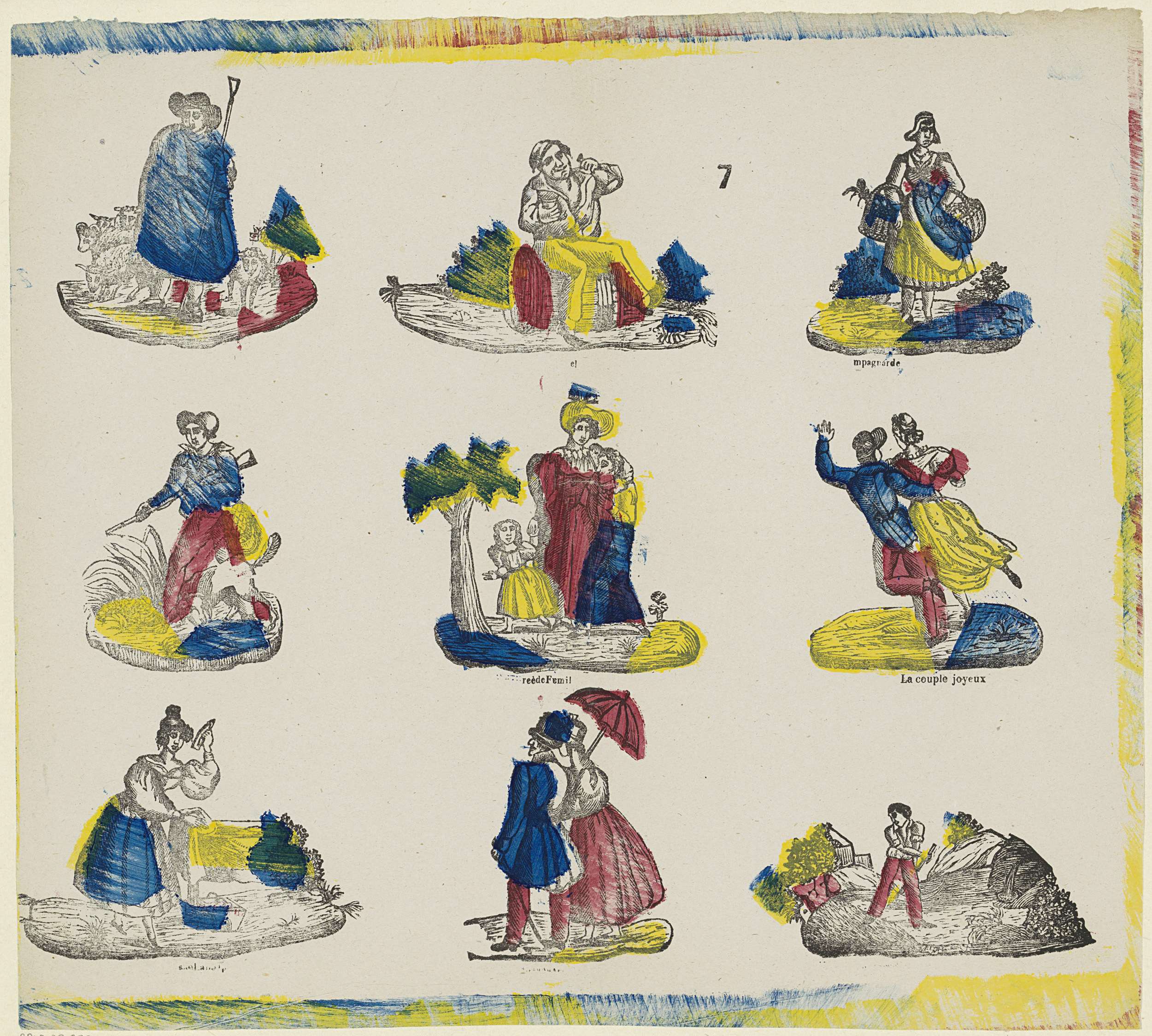 Blad met 9 voorstellingen van verschillende figuren, zoals een herder, een vrolijk stelletje en een jager. Onder verschillende afbeeldingen een onderschrift in het Frans. Genummerd midden boven: 7.