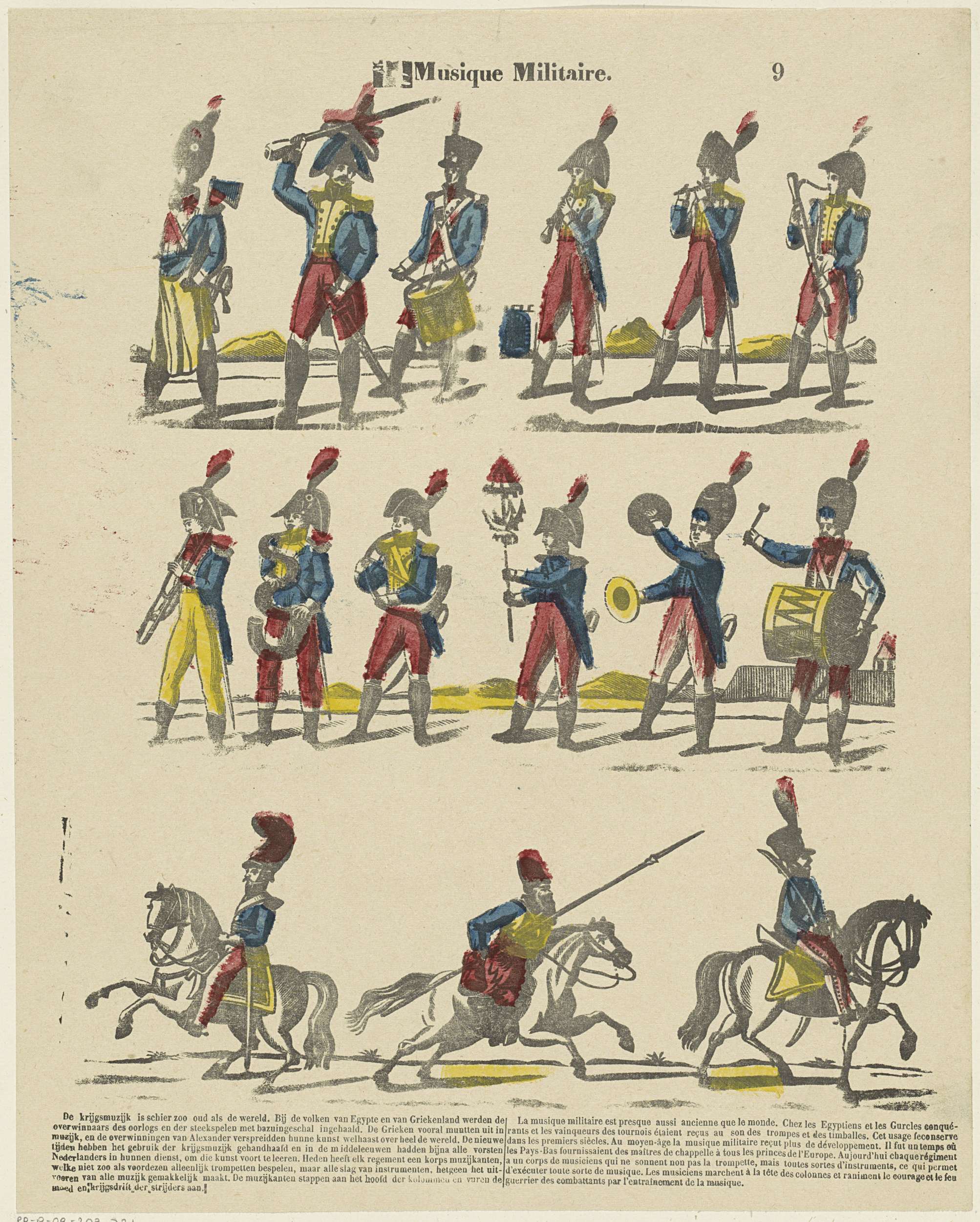 Blad met 3 horizontale rijen met voorstellingen van militairen met muziekinstrumenten en militairen te paard. In de ondermarge een onderschrift in het Nederlands en in het Frans. Genummerd rechtsboven: 9.