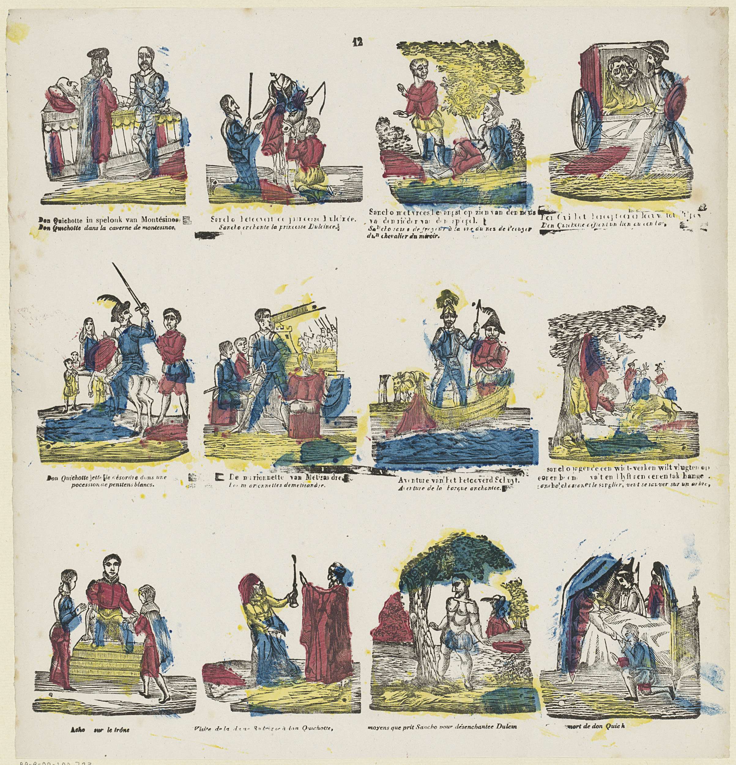Blad met 12 voorstellingen uit het verhaal van Don Quichot. Onder elke afbeelding een onderschrift in het Frans en soms ook in het Nederlands. Genummerd midden boven: 12.