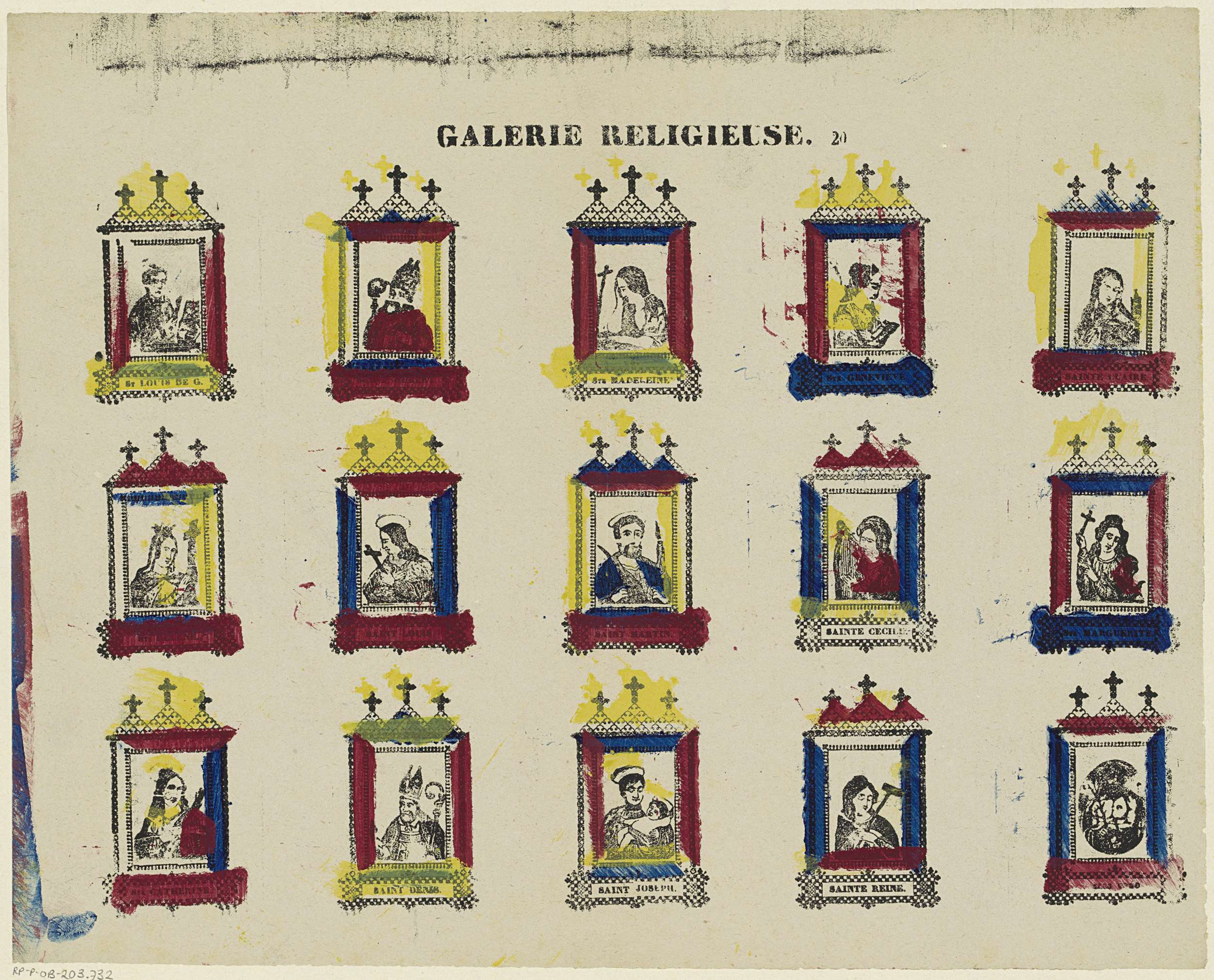 Blad met 15 bidprentjes met voorstellingen van heiligen in een sierlijst, met onderin telkens de naam van de heilige. Genummerd midden boven: 20.
