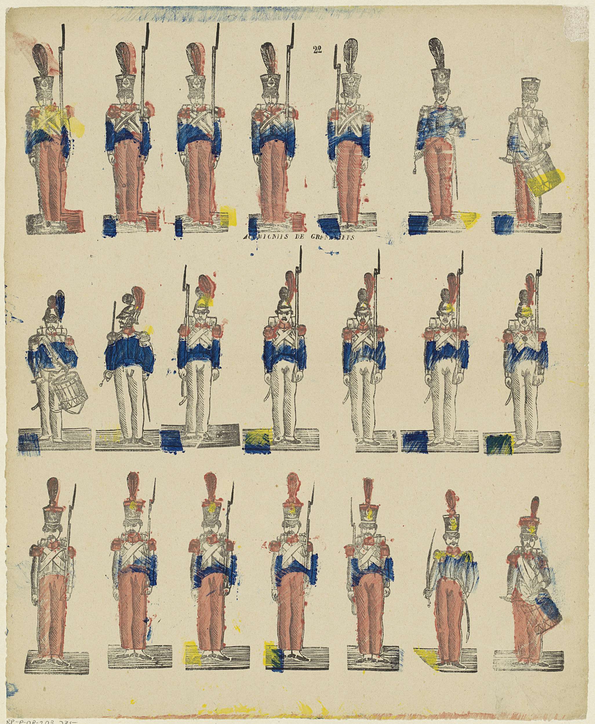 Blad met 21 voorstellingen van militairen. Genummerd midden boven: 22.