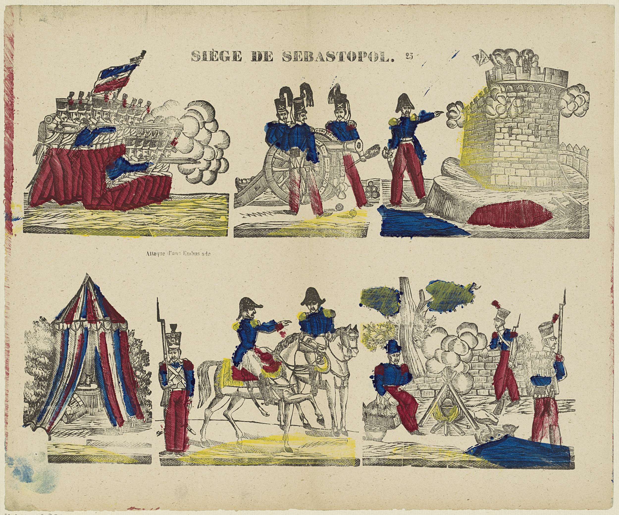 Blad met 6 voorstellingen over de belegering van Sebastopol (1854-1855). Onder één afbeelding een onderschrift in het Frans. Genummerd midden boven: 23.