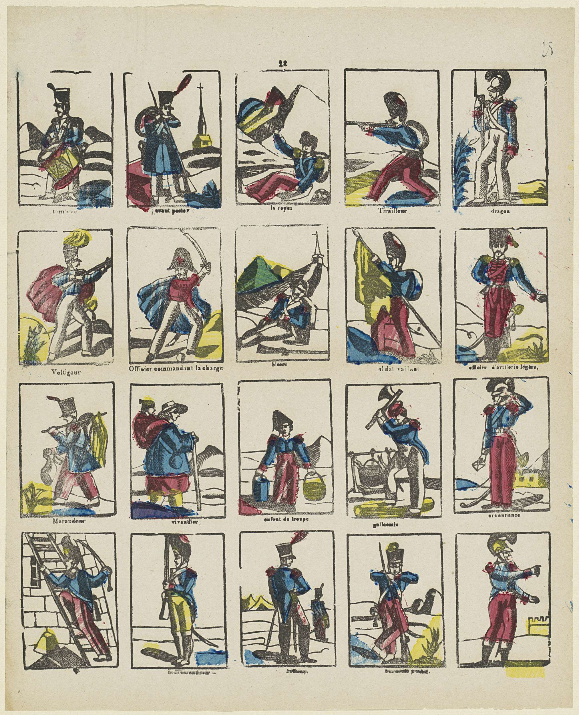 Blad met 20 voorstellingen van militairen. Onder enkele voorstellingen een onderschrift in het Frans. Genummerd midden boven: 28.