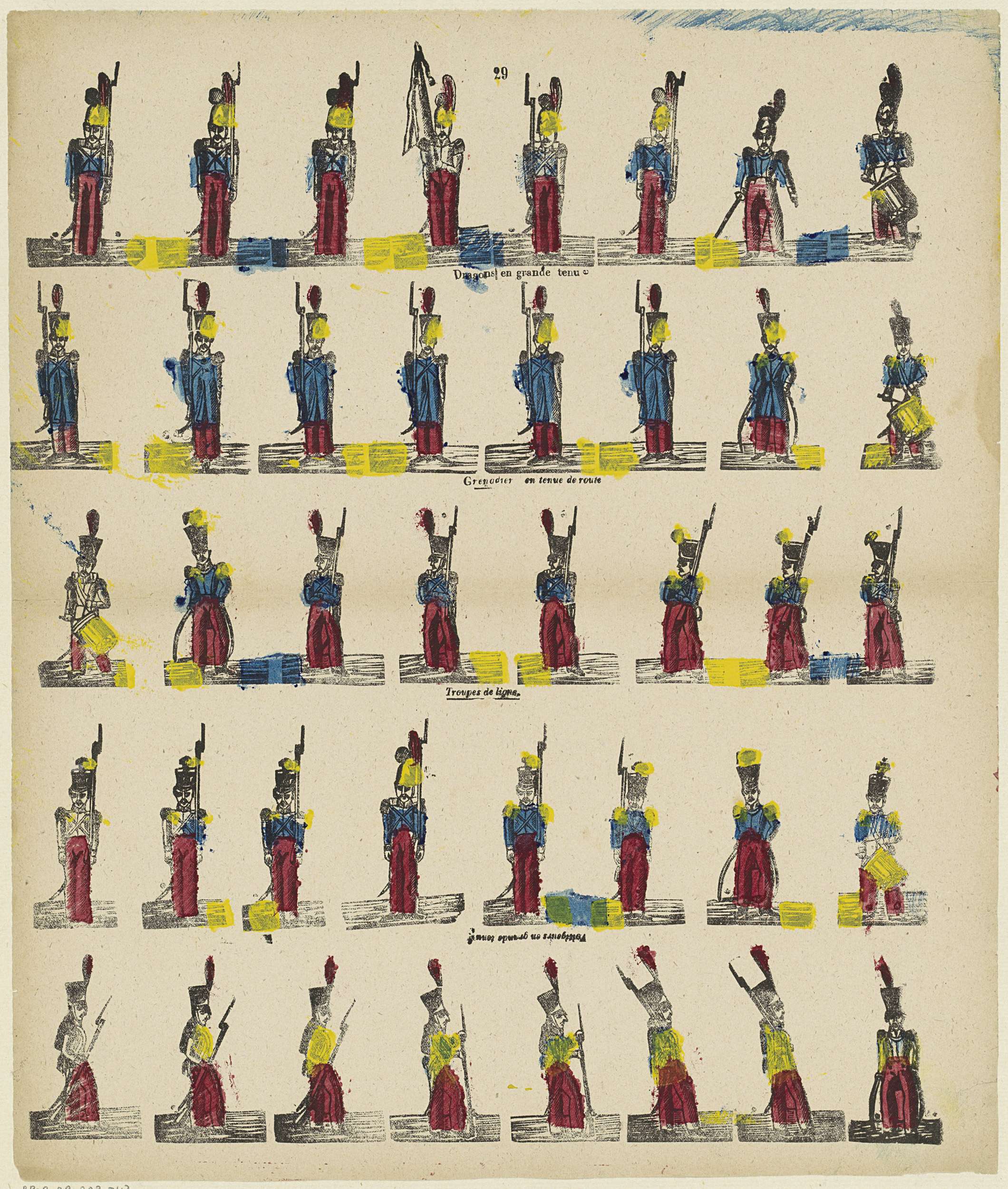 Blad met 40 voorstellingen van militairen, waaronder dragonders en grenadiers. Onder enkele voorstellingen een onderschrift in het Frans. Genummerd midden boven: 29.