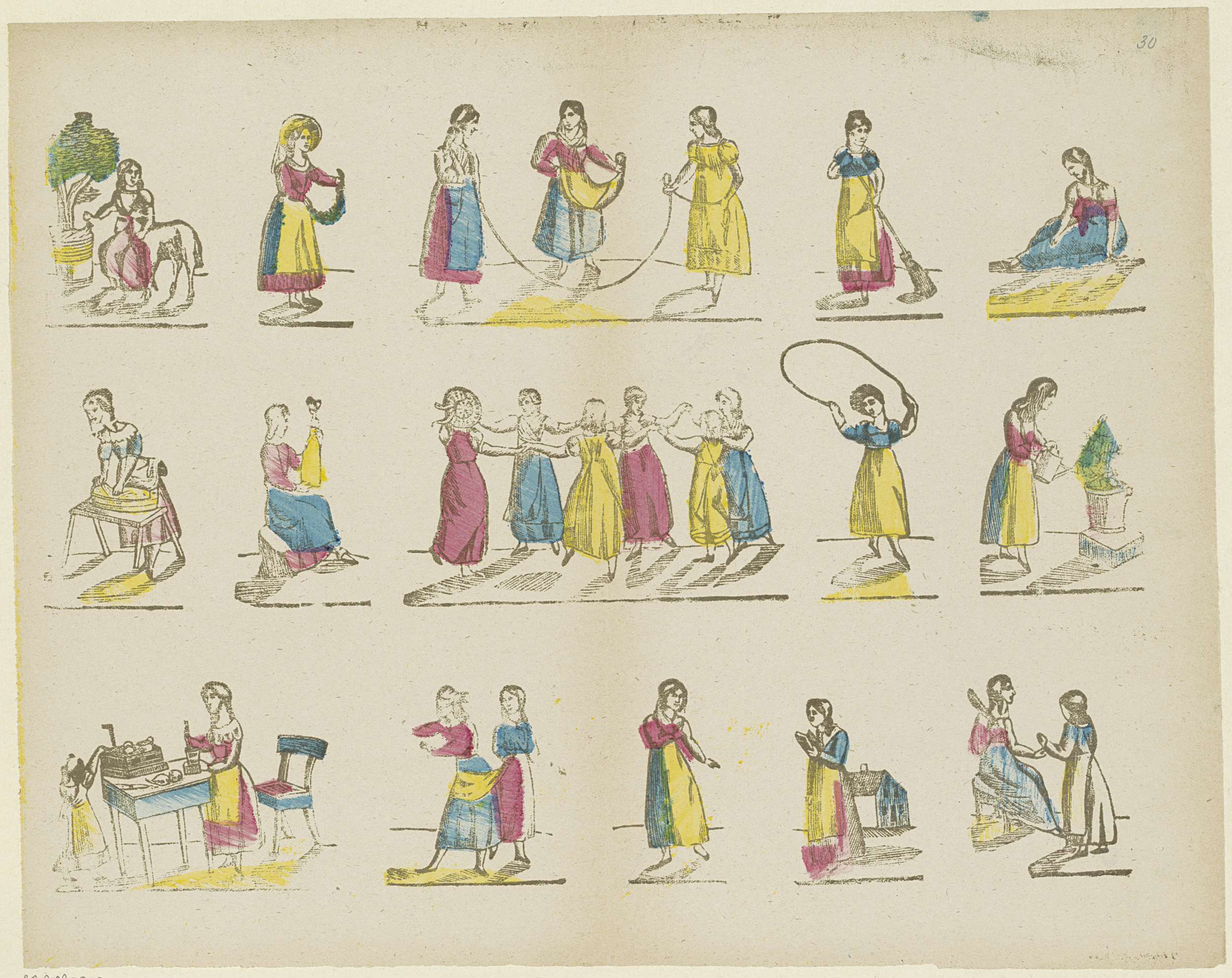 Blad met 15 voorstellingen van kinderspelen en bezigheden, zoals touwtjespringen, met de pop spelen en blindemannetje.