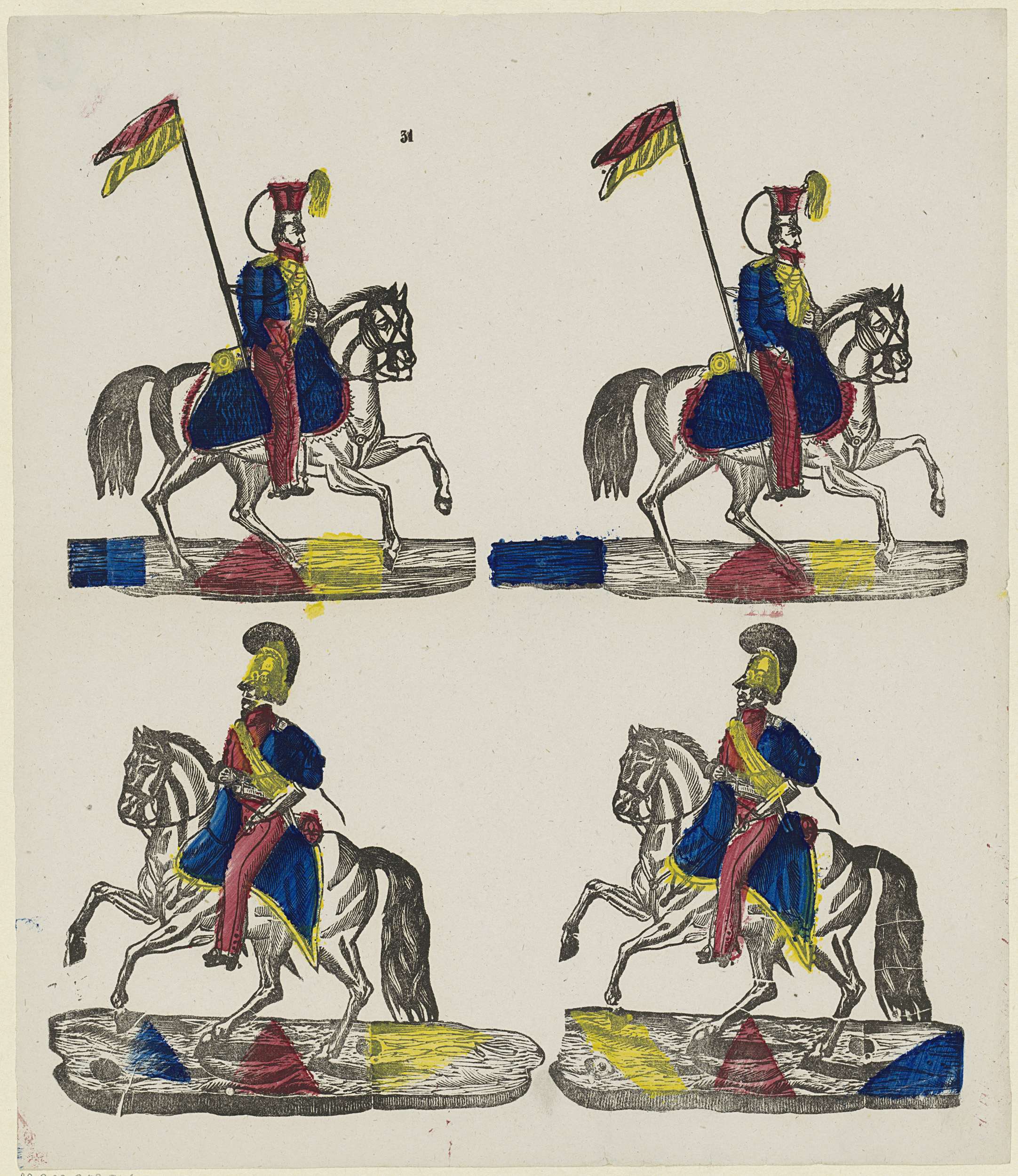 Blad met 4 voorstellingen van militairen (lansiers en kurassiers) te paard. Genummerd midden boven: 31.