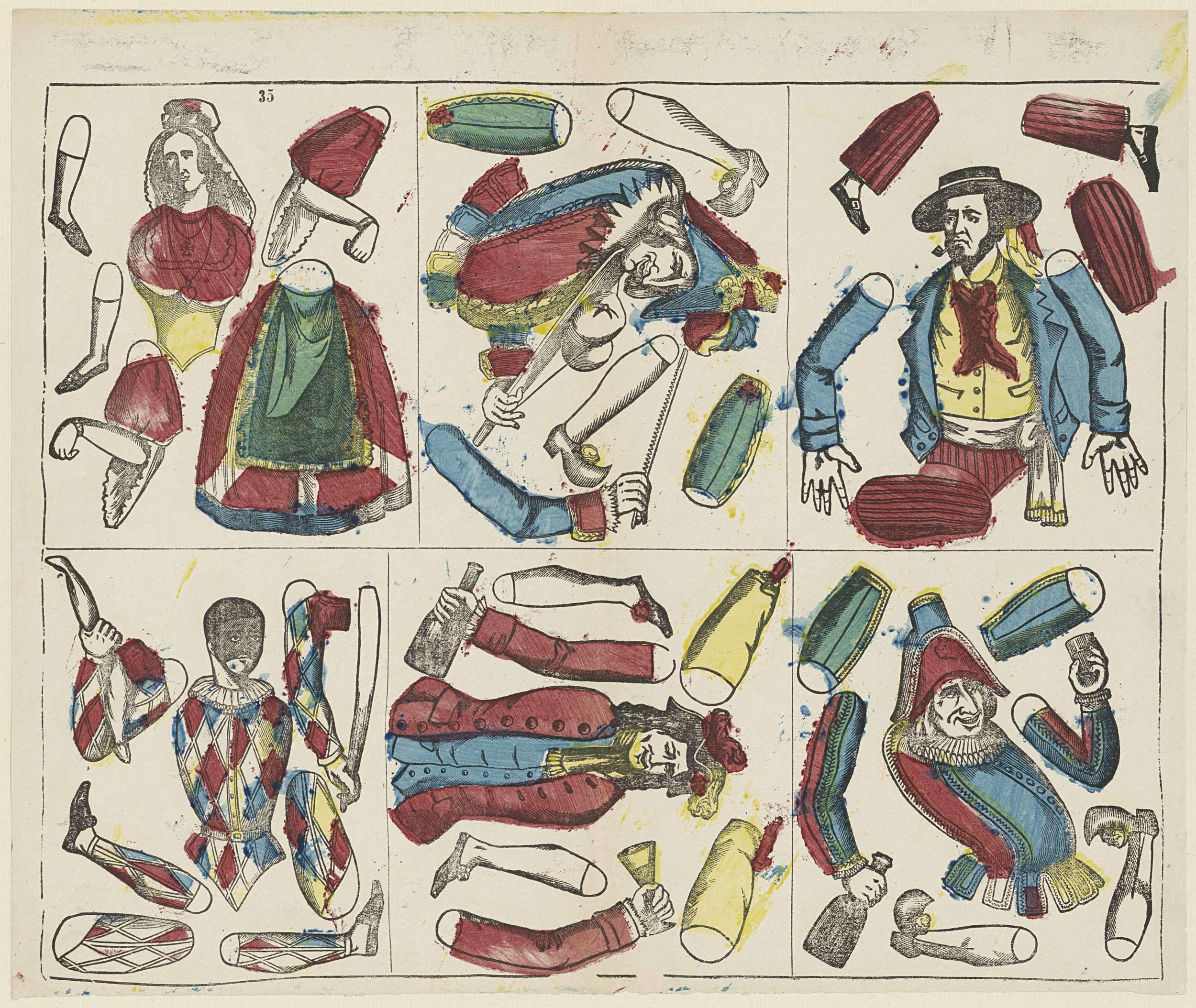 Blad met 6 voorstellingen van verschillende trekpoppen om uit te knippen, van figuren uit de Commedia dell'arte. Genummerd linksboven: 35.