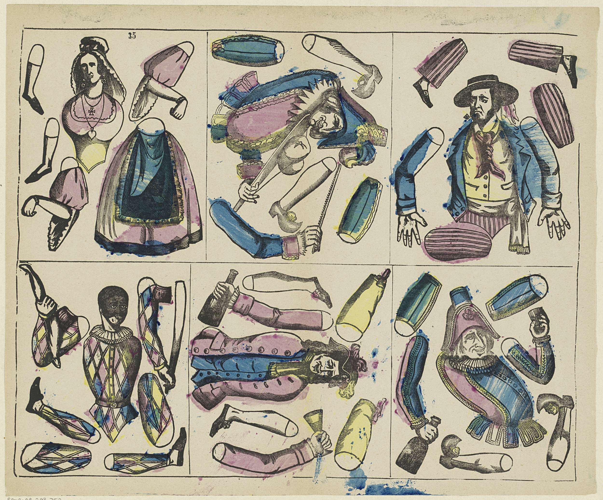 Blad met 6 voorstellingen van verschillende trekpoppen om uit te knippen, van figuren uit de Commedia dell'arte. Genummerd linksboven: 35.