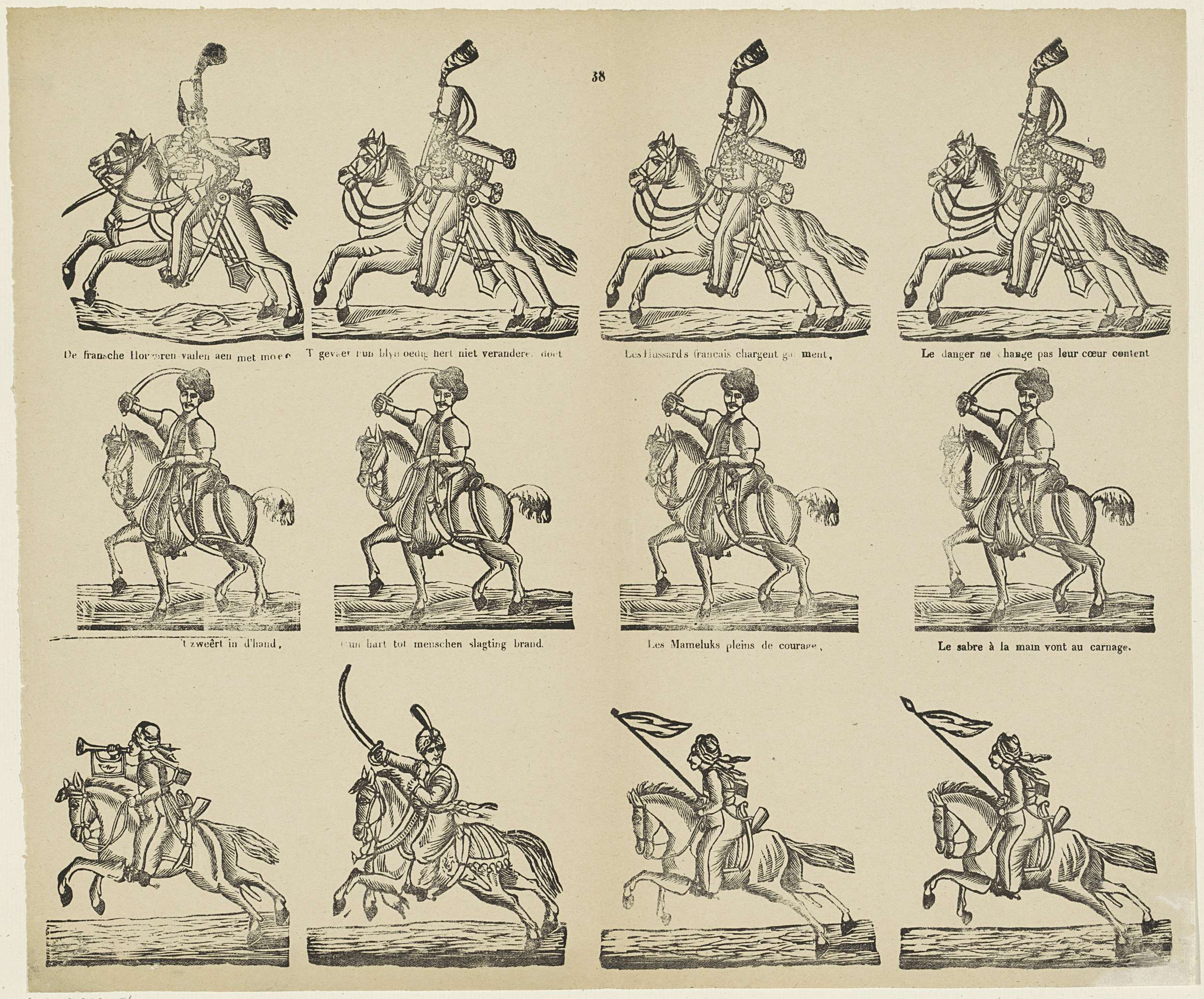 Blad met 12 voorstellingen van militairen te paard. Onder enkele afbeeldingen een onderschrift in het Frans. Genummerd midden boven: 38.