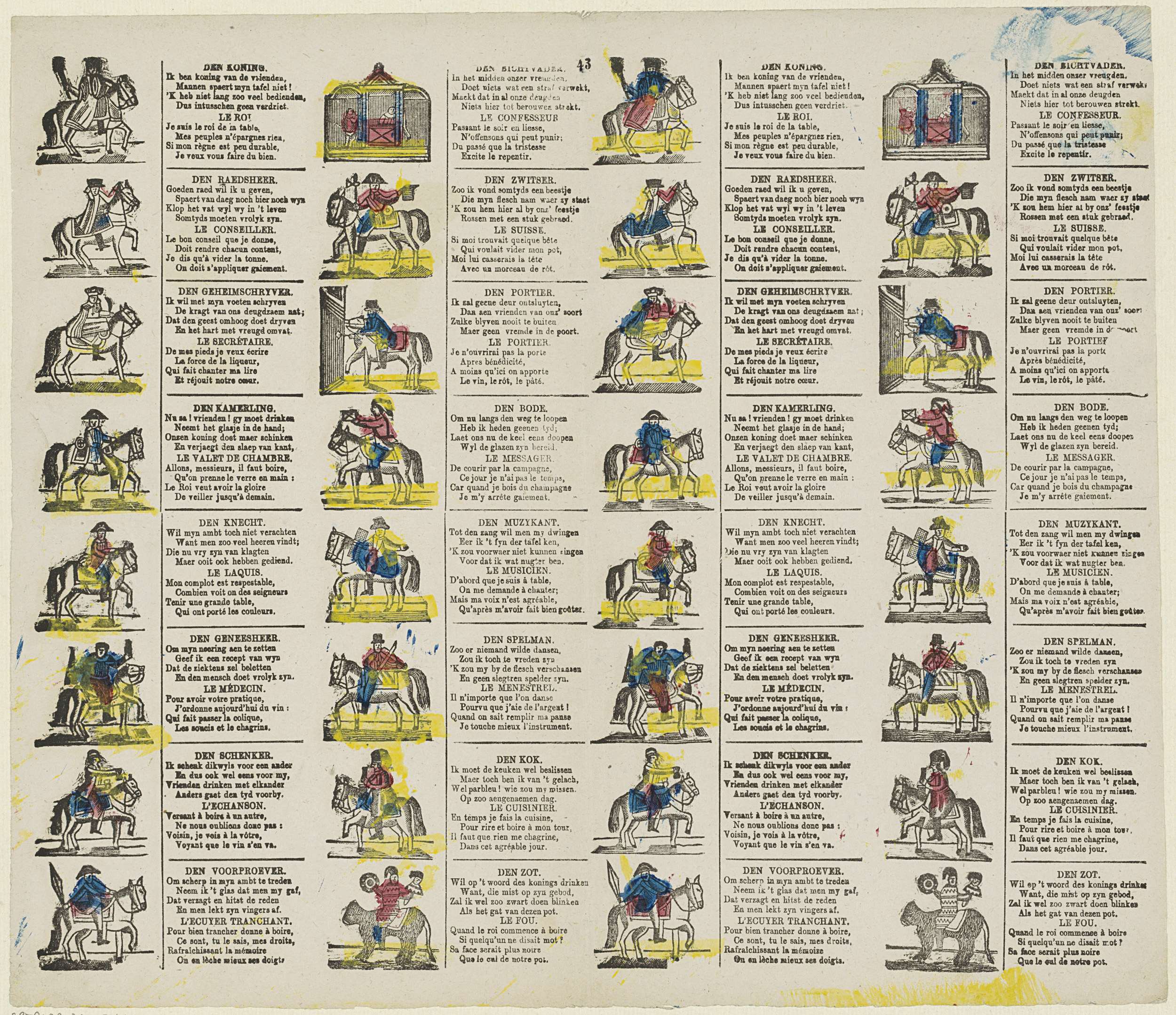 Blad met 32 voorstellingen (driekoningenbriefjes) van verschillende functies binnen het hof, waaronder een raadsman, een proever en een portier. Rechts naast elke afbeelding een vierregelig vers in het Nederlands en in het Frans. Genummerd midden boven: 43.