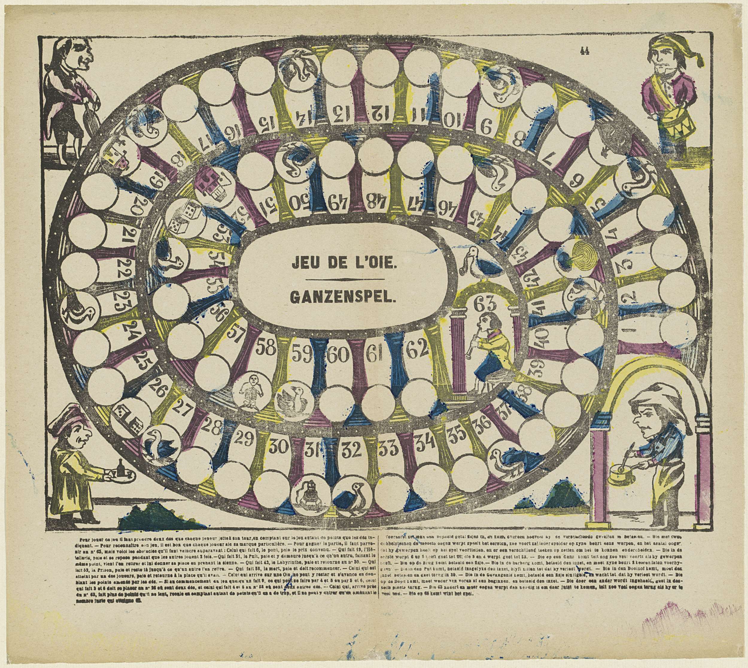 Ganzenbordspel met een spiraal met vakjes genummerd van 1 tot en met 63. In enkele vakjes voorstellingen van ganzen. Op het middenveld de titel, in de ondermarge de spelregels in boekdruk in het Nederlands en in het Frans. Genummerd rechtsboven: 44.
