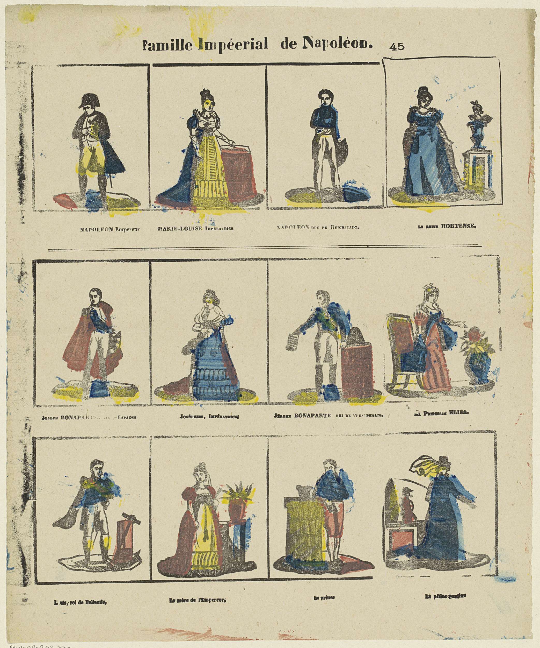 Blad met 12 voorstellingen van familieleden van Napoleon I Bonaparte. Onder elke afbeelding een onderschrift in het Frans. Genummerd rechtsboven: 45.