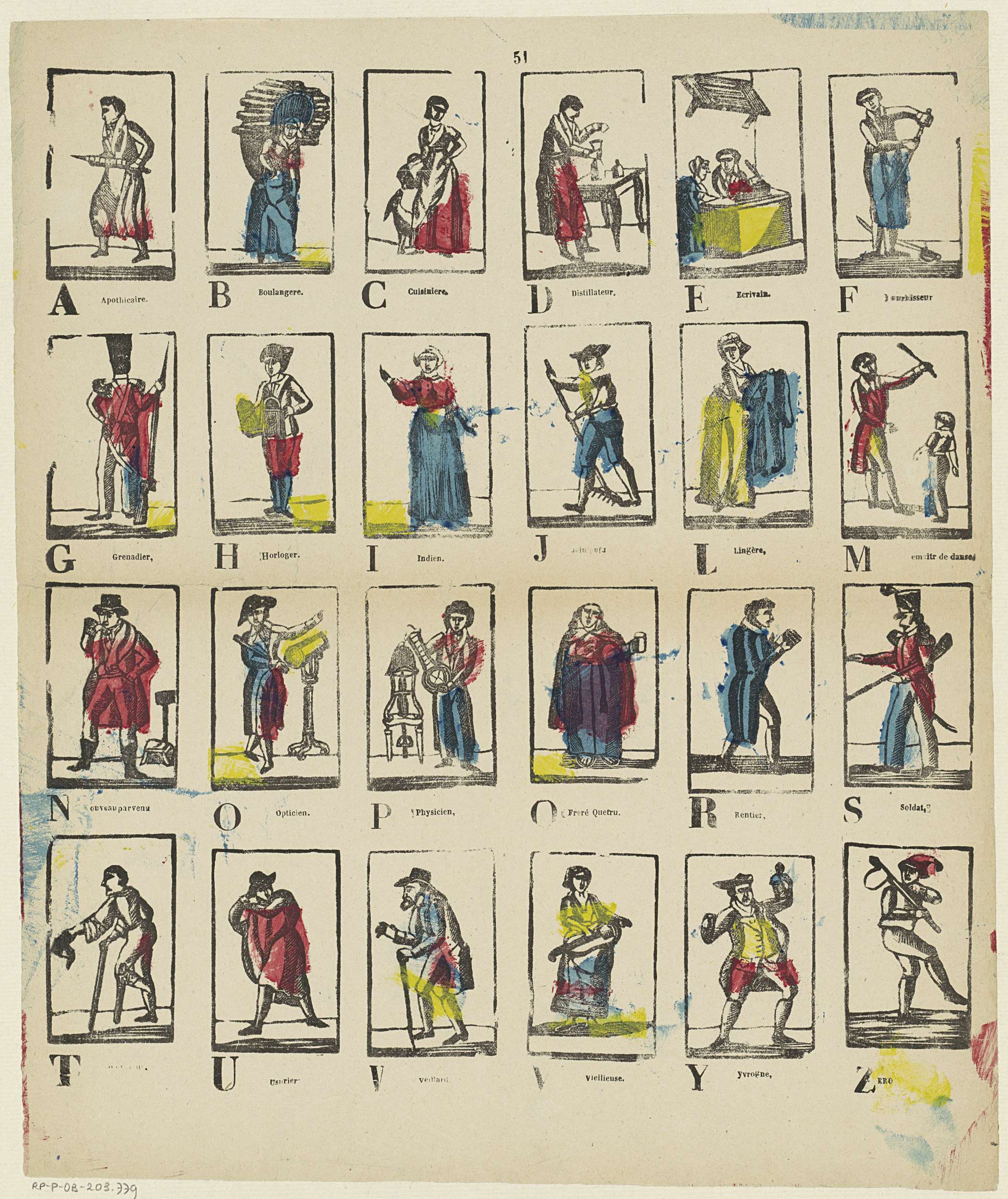 Blad met 24 voorstellingen van de letters van het alfabet geïllustreerd met beroepen en figuren waarvan de woorden met de betreffende letter beginnen. Onder elke afbeelding een onderschrift in het Frans. Genummerd midden boven: 51.