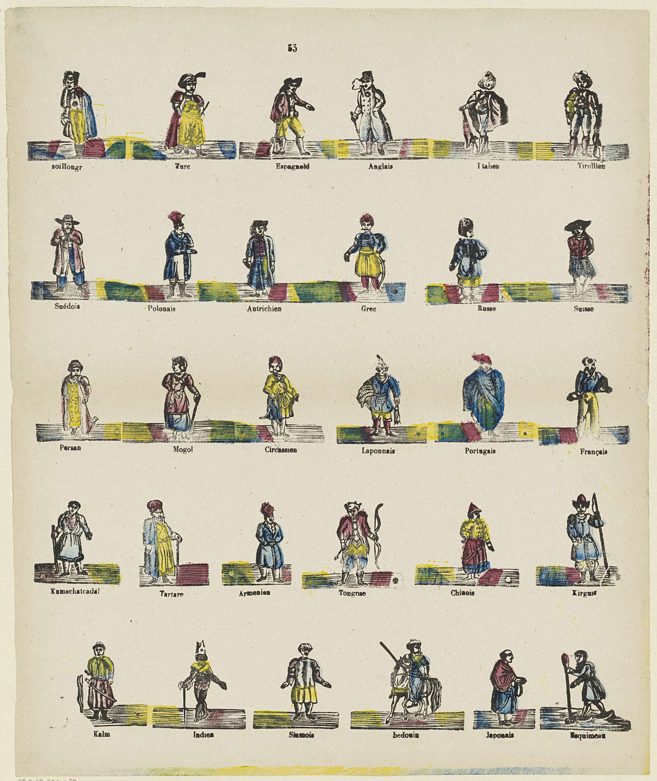 Blad met 30 voorstellingen van verschillende vreemde volkeren. Onder elke afbeelding een onderschrift in het Frans. Genummerd midden boven: 53.