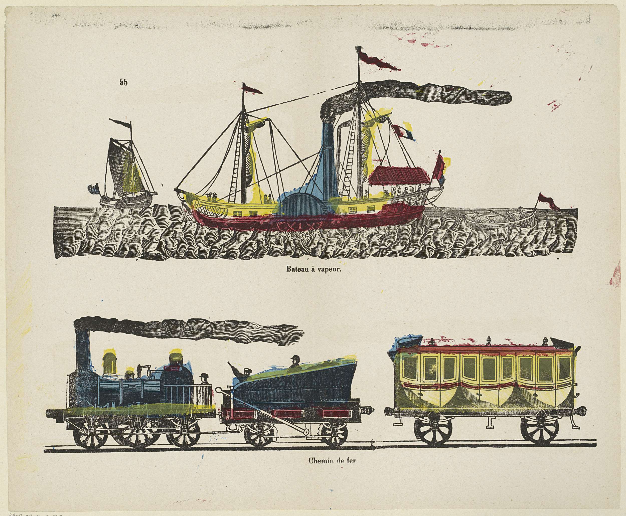 Blad met 2 voorstellingen. Boven een voorstelling van een stoomboot op zee. Onder een voorstelling van een stoomtrein. Onder elke afbeelding een onderschrift in het Frans. Genummerd linksboven: 55.