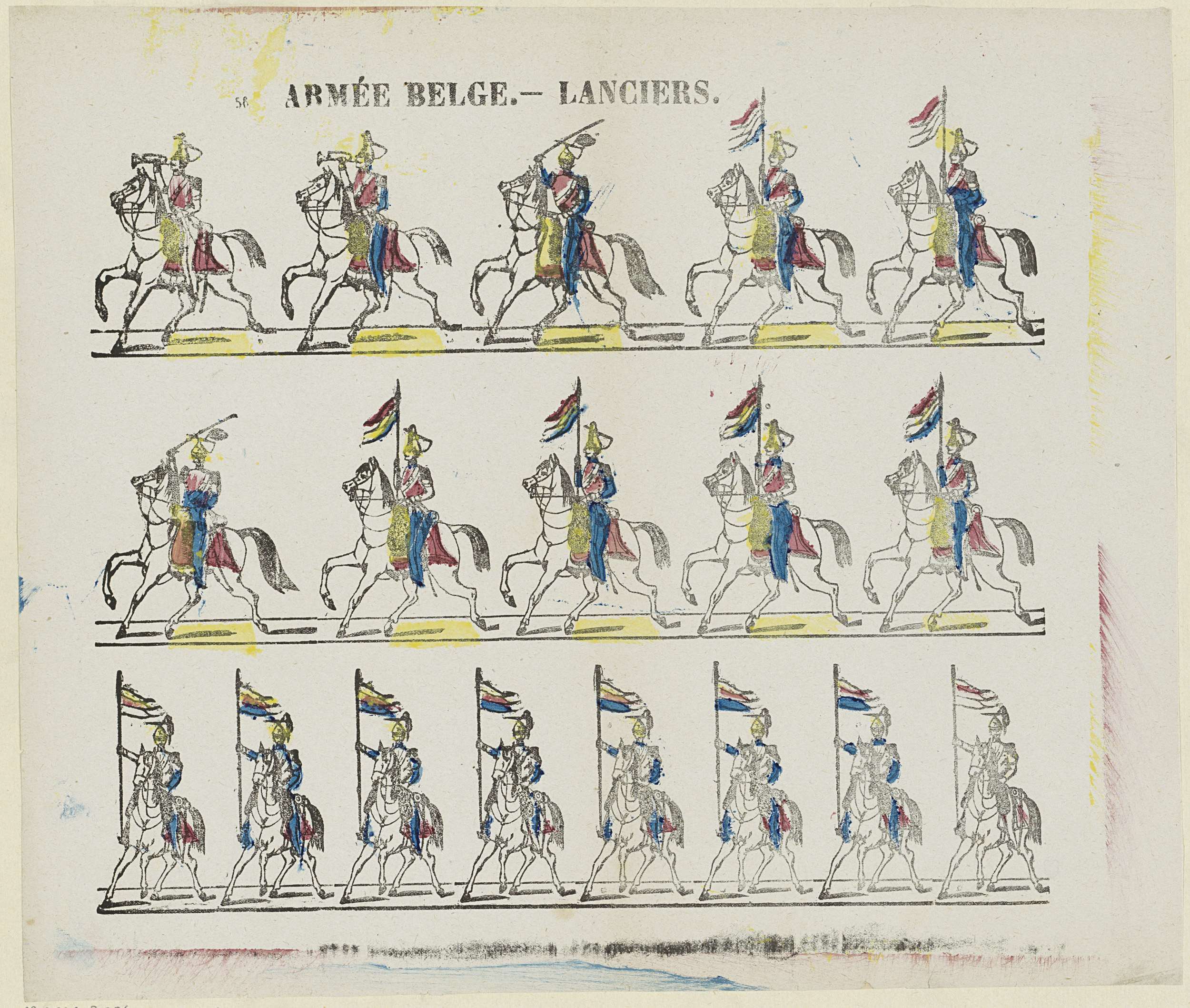 Blad met 3 horizontale rijen met in totaal 18 voorstellingen van militairen te paard. Genummerd linksboven: 56.