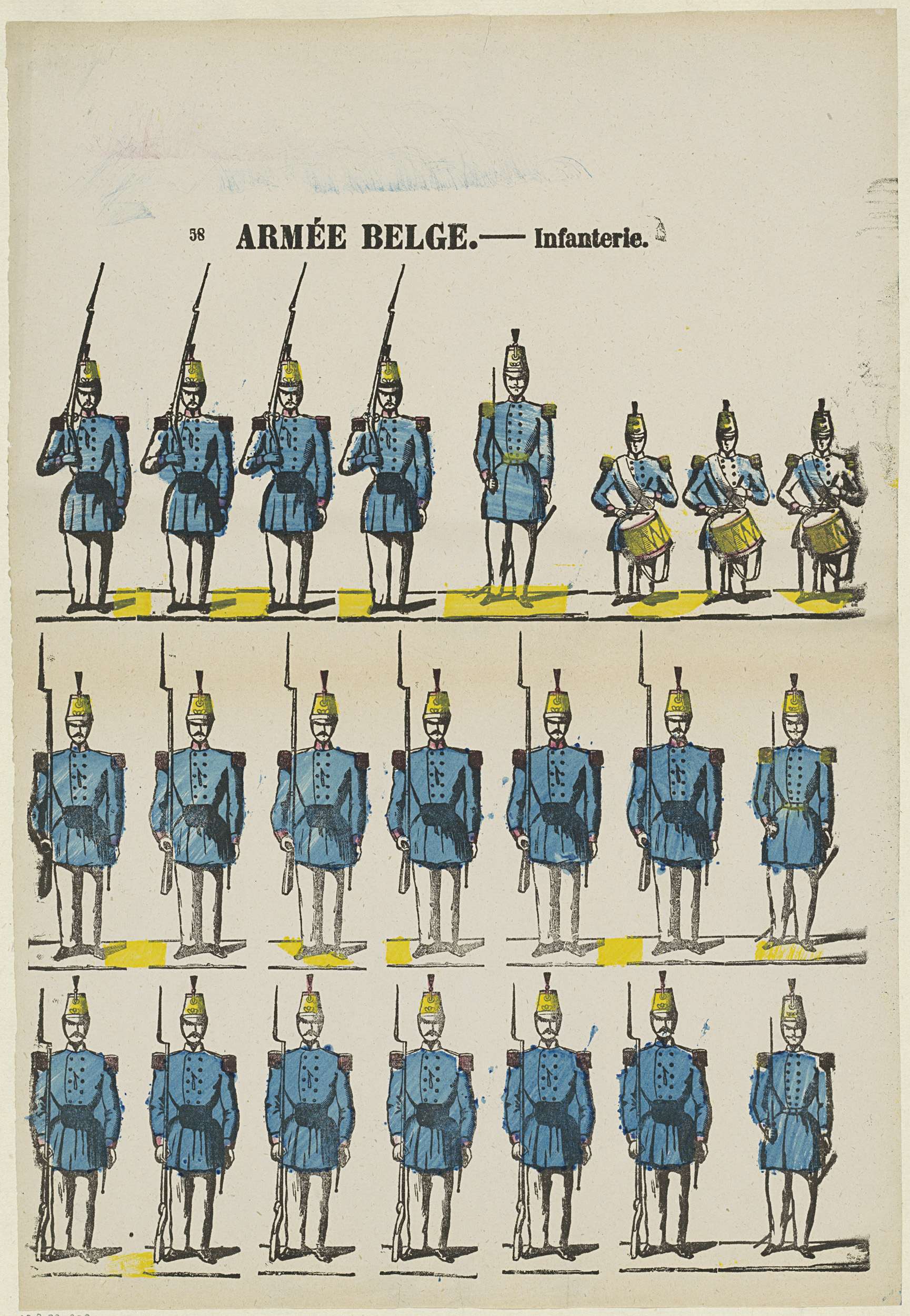 Blad met 22 voorstellingen van militairen (infanteristen). Genummerd linksboven: 58.