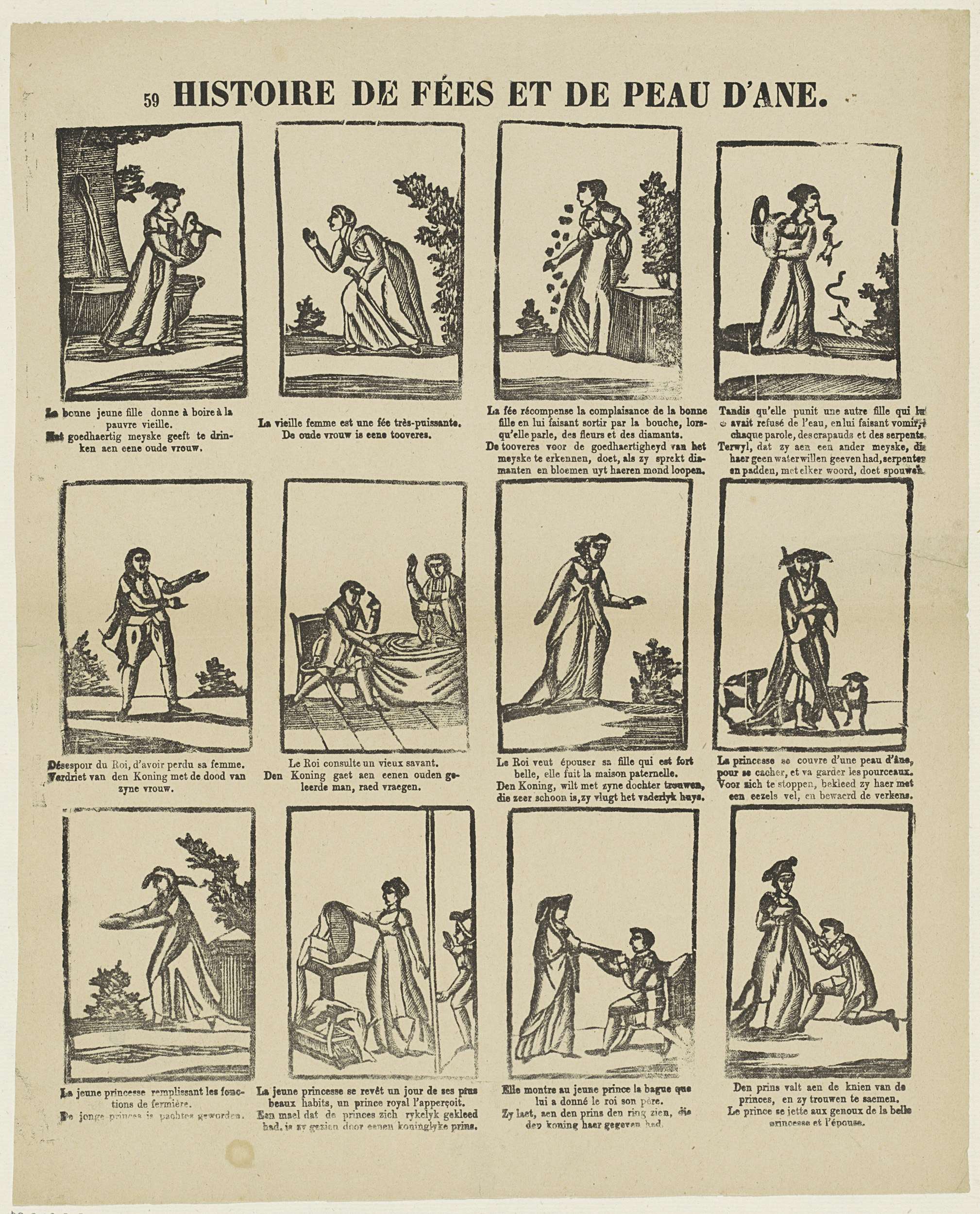 Blad met 12 voorstellingen. Boven vier voorstellingen over twee meiden die betoverd worden door een tovenares. Onder acht voorstellingen over een princes die zich verstopt door het aantrekken van de huid van een ezel. Onder elke afbeelding een onderschrift in het Nederlands en in het Frans. Genummerd linksboven: 59.