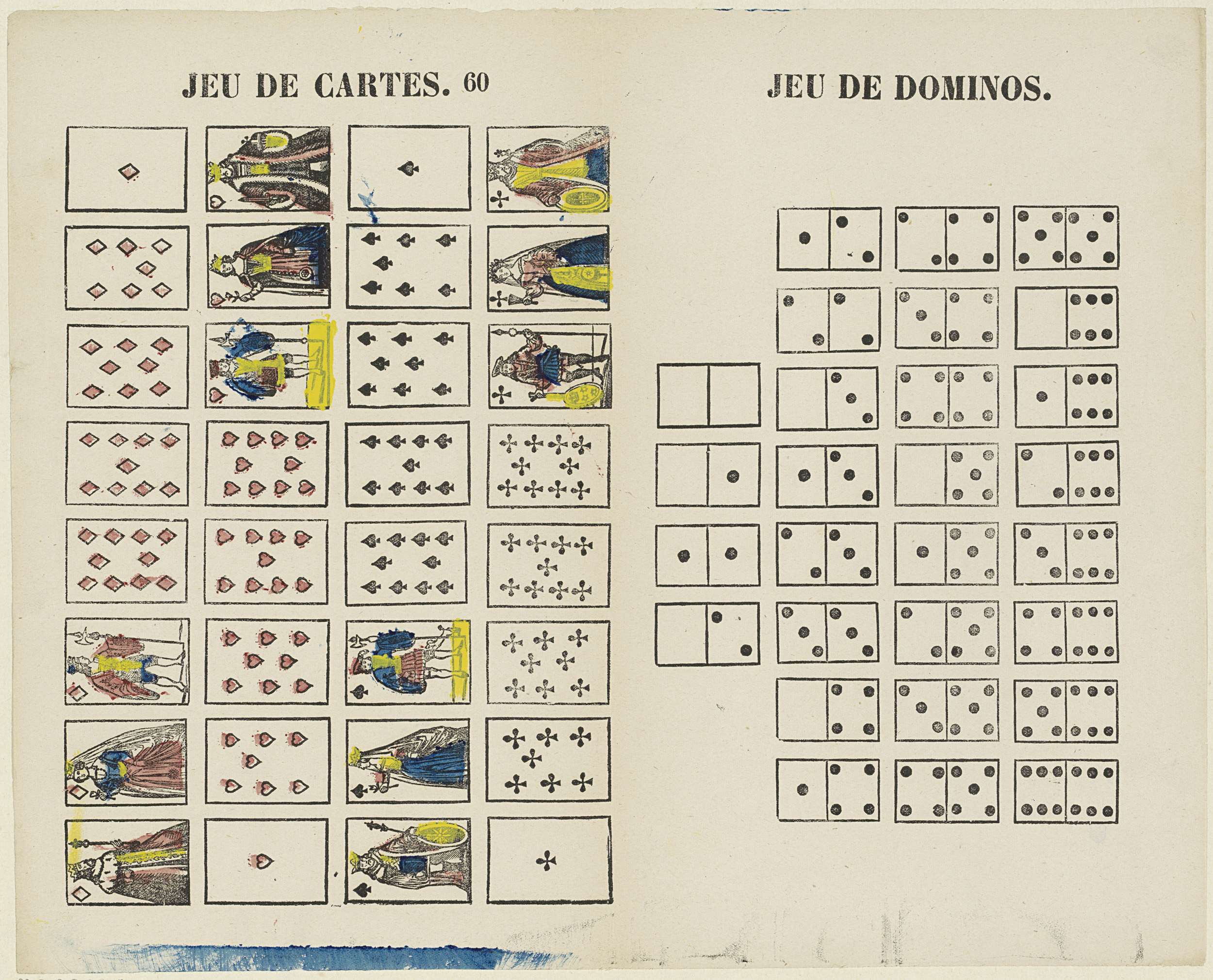 Blad met 32 speelkaarten en 28 dominostenen om uit te knippen. Genummerd midden boven: 60.