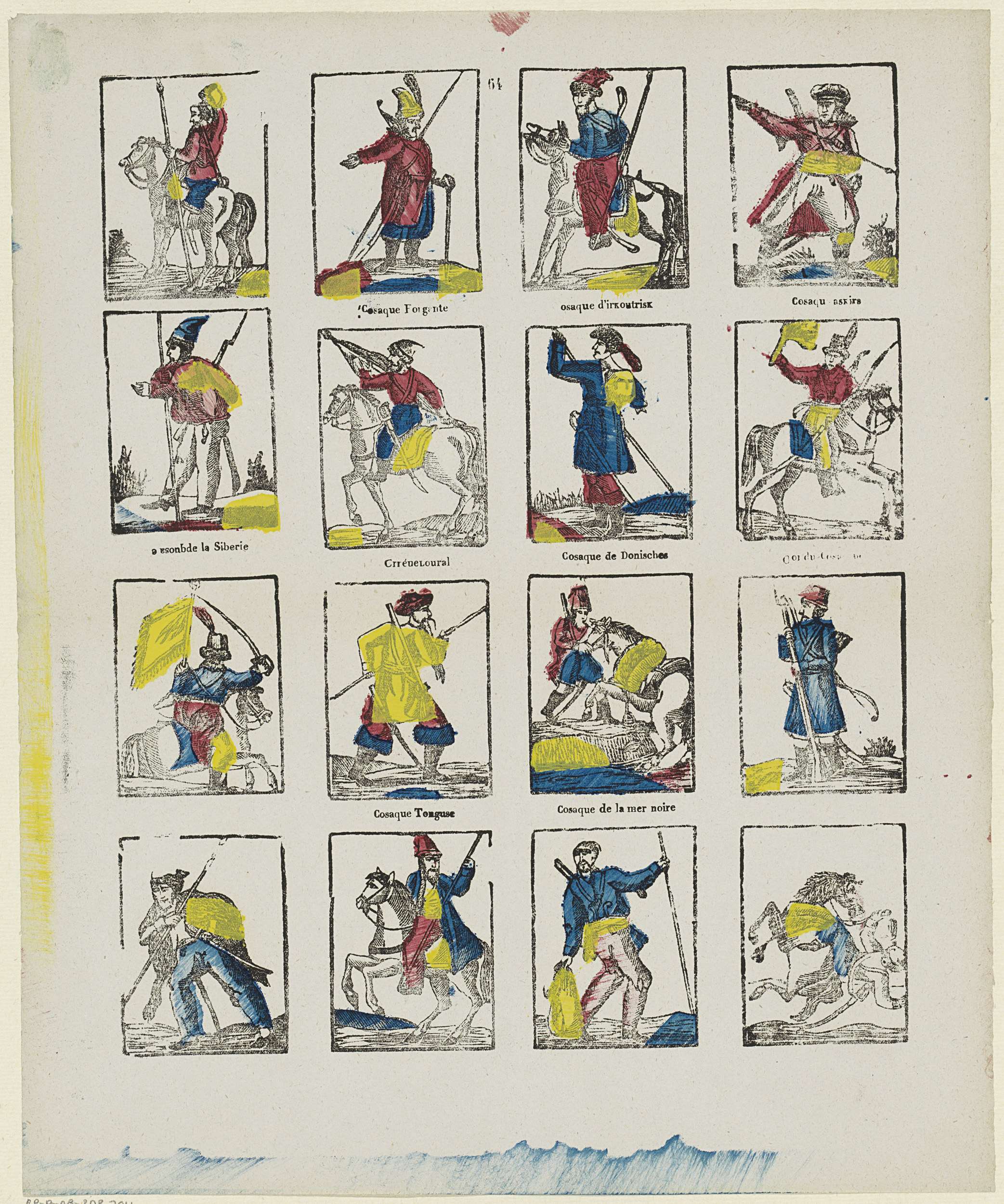 Blad met 16 voorstellingen van kozakken (militairen). Onder enkele afbeeldingen een onderschrift in het Frans. Genummerd midden boven: 64.