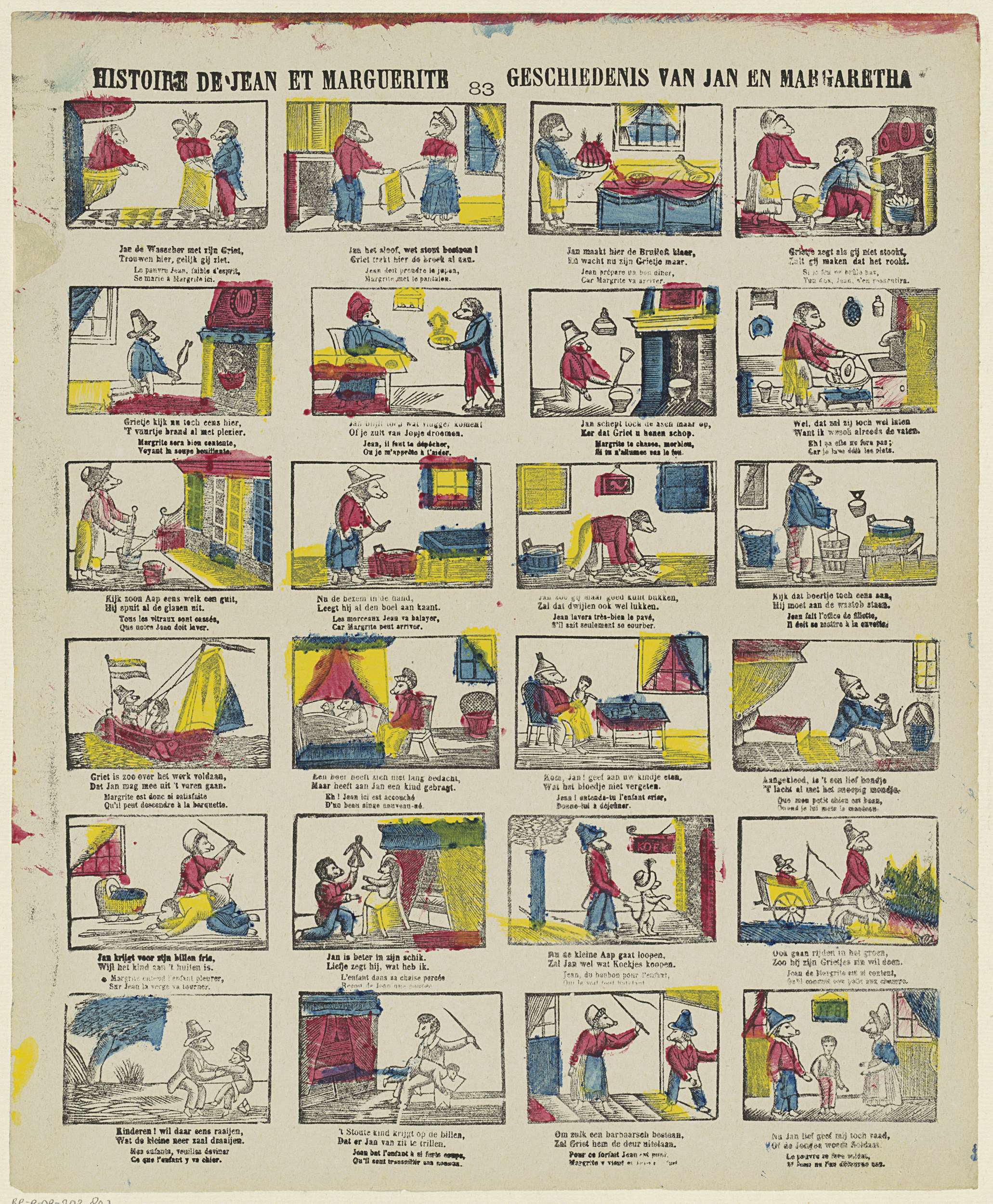 Blad met 24 voorstellingen uit het leven van Jan de Wasser, een man die van zijn vrouw Griet, die de broek aan heeft, al het huishoudelijk werk moet doen. Uitgebeeld met apen in plaats van mensen. Onder elke voorstelling een tweeregelig vers in het Nederlands en in het Frans. Genummerd midden boven: 83.