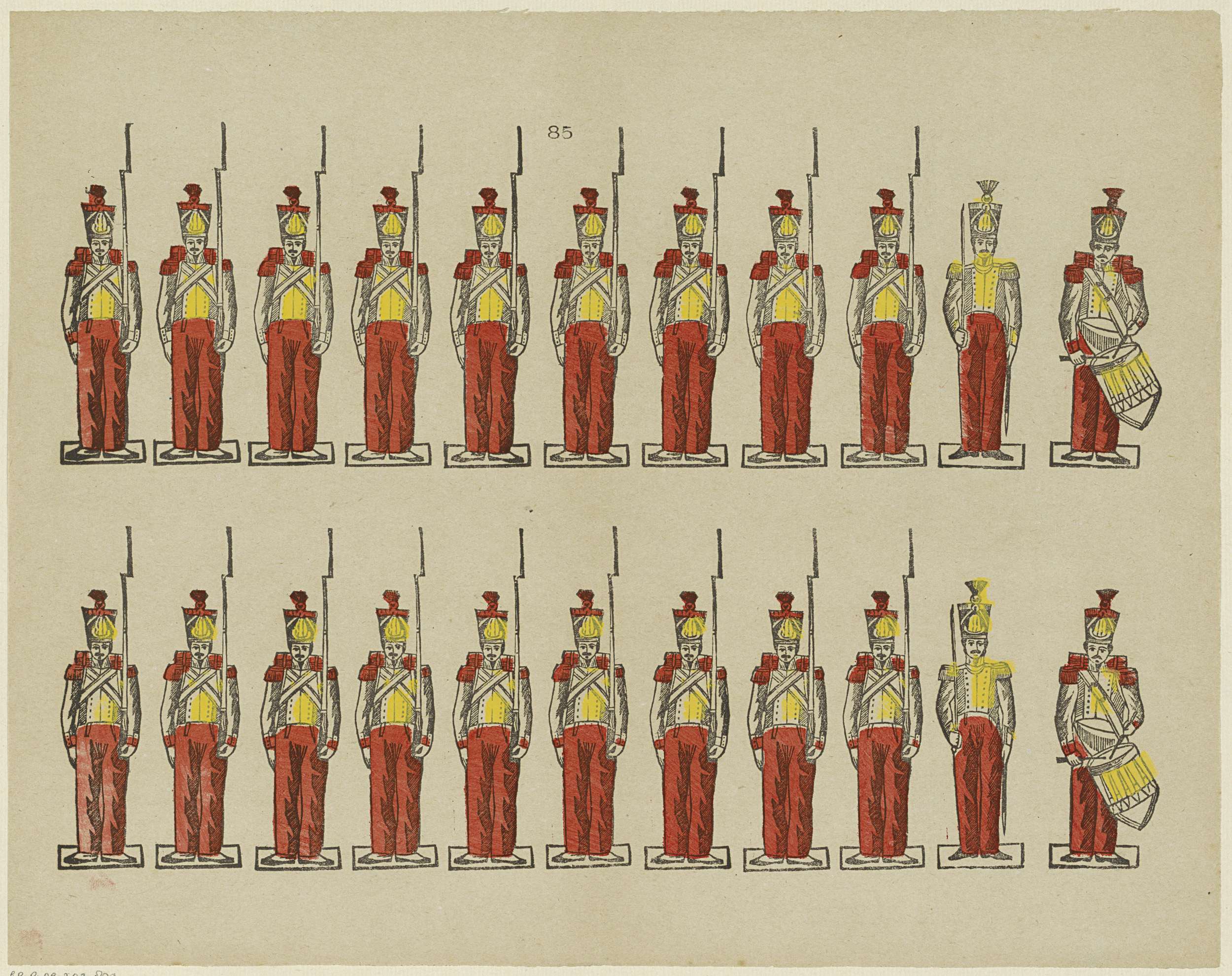 Blad met 22 voorstellingen van militairen. Genummerd midden boven: 85.