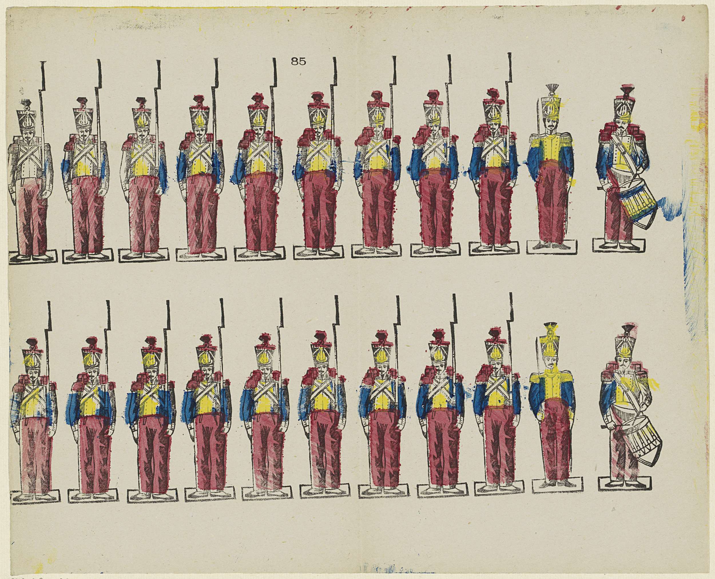 Blad met 22 voorstellingen van militairen. Genummerd midden boven: 85.