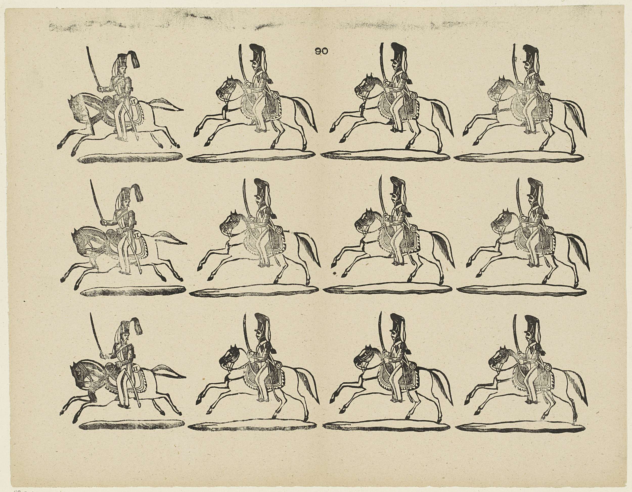 Blad met 12 voorstellingen van militairen te paard. Genummerd midden boven: 90.