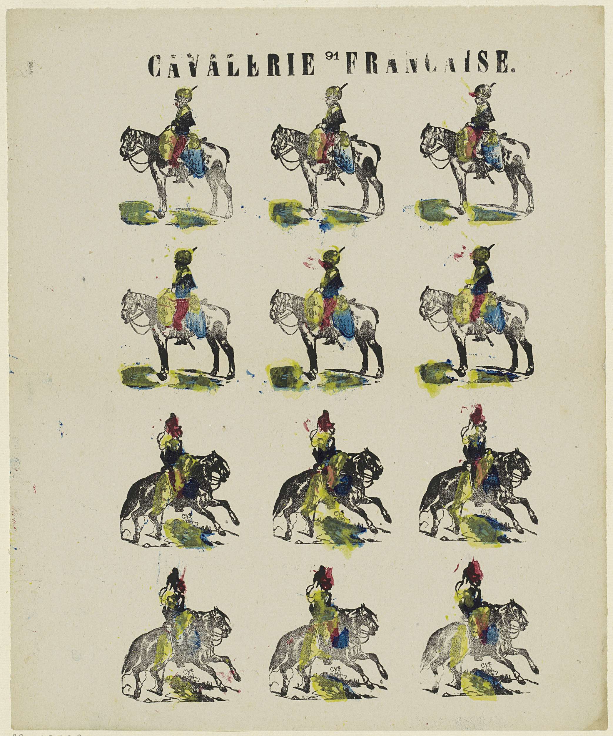 Blad met 12 voorstellingen van Franse militairen te paard. Genummerd midden boven: 91.