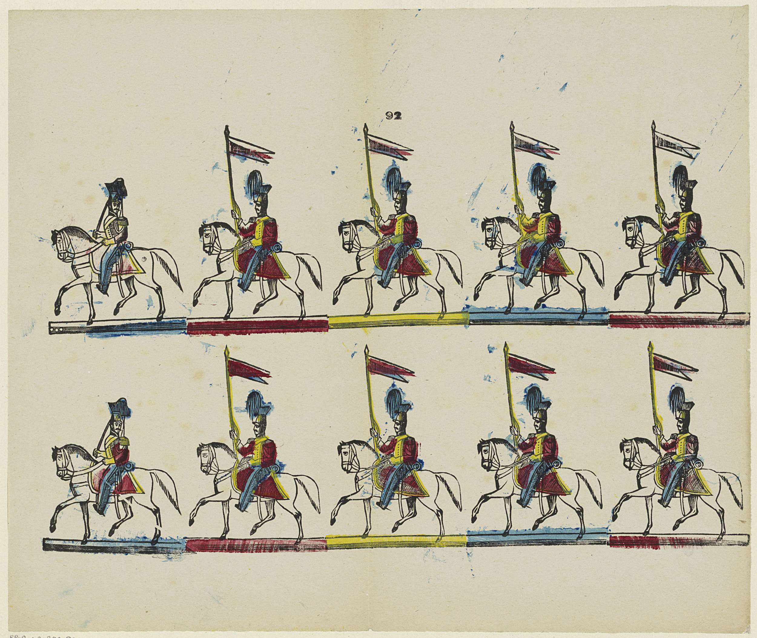 Blad met 10 voorstellingen van militairen te paard. Genummerd midden boven: 92.