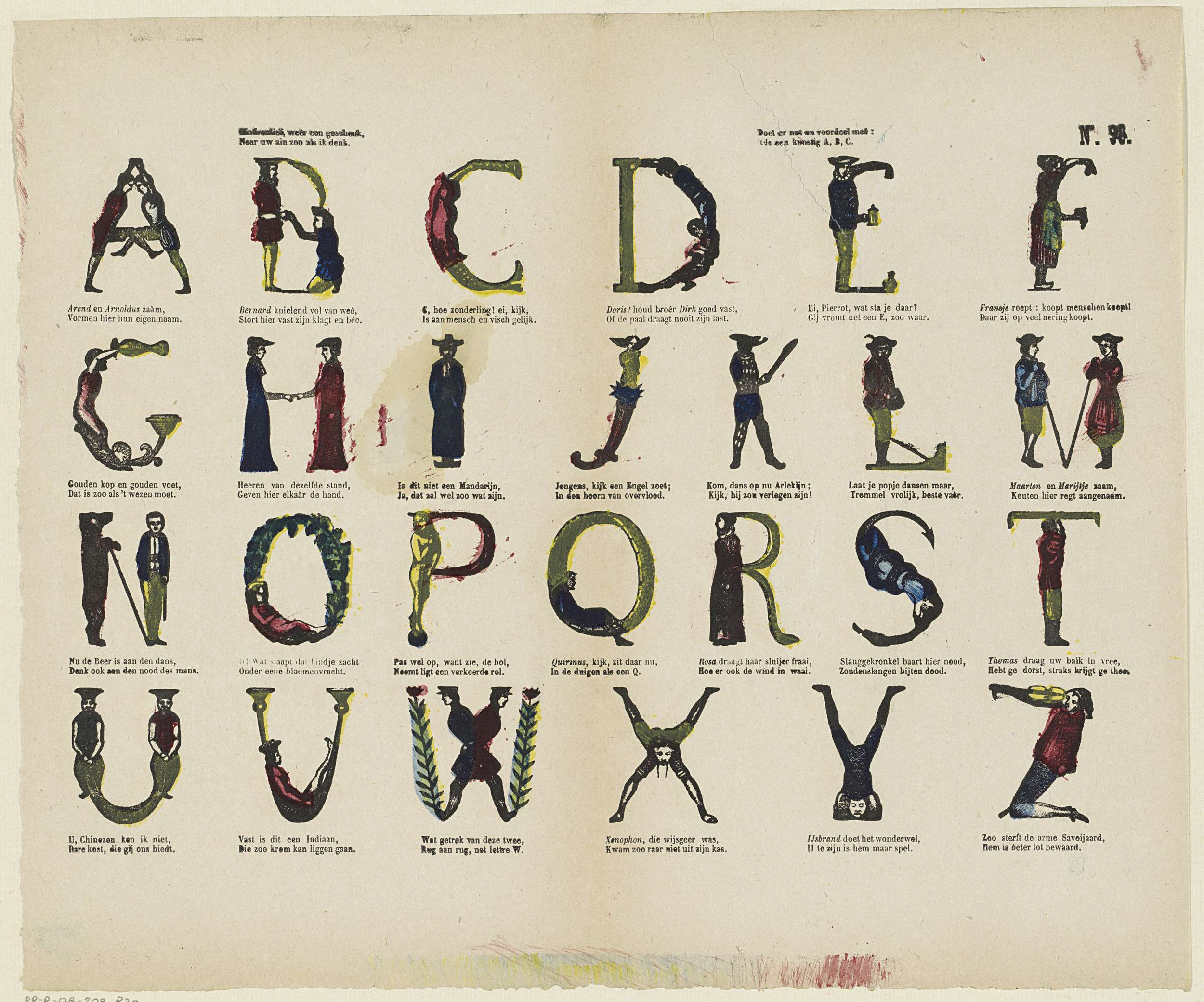 Blad met 26 voorstellingen van de letters van het alfabet uitgebeeld door figuren. Onder elke afbeelding een tweeregelig vers. Genummerd rechtsboven: No. 98.