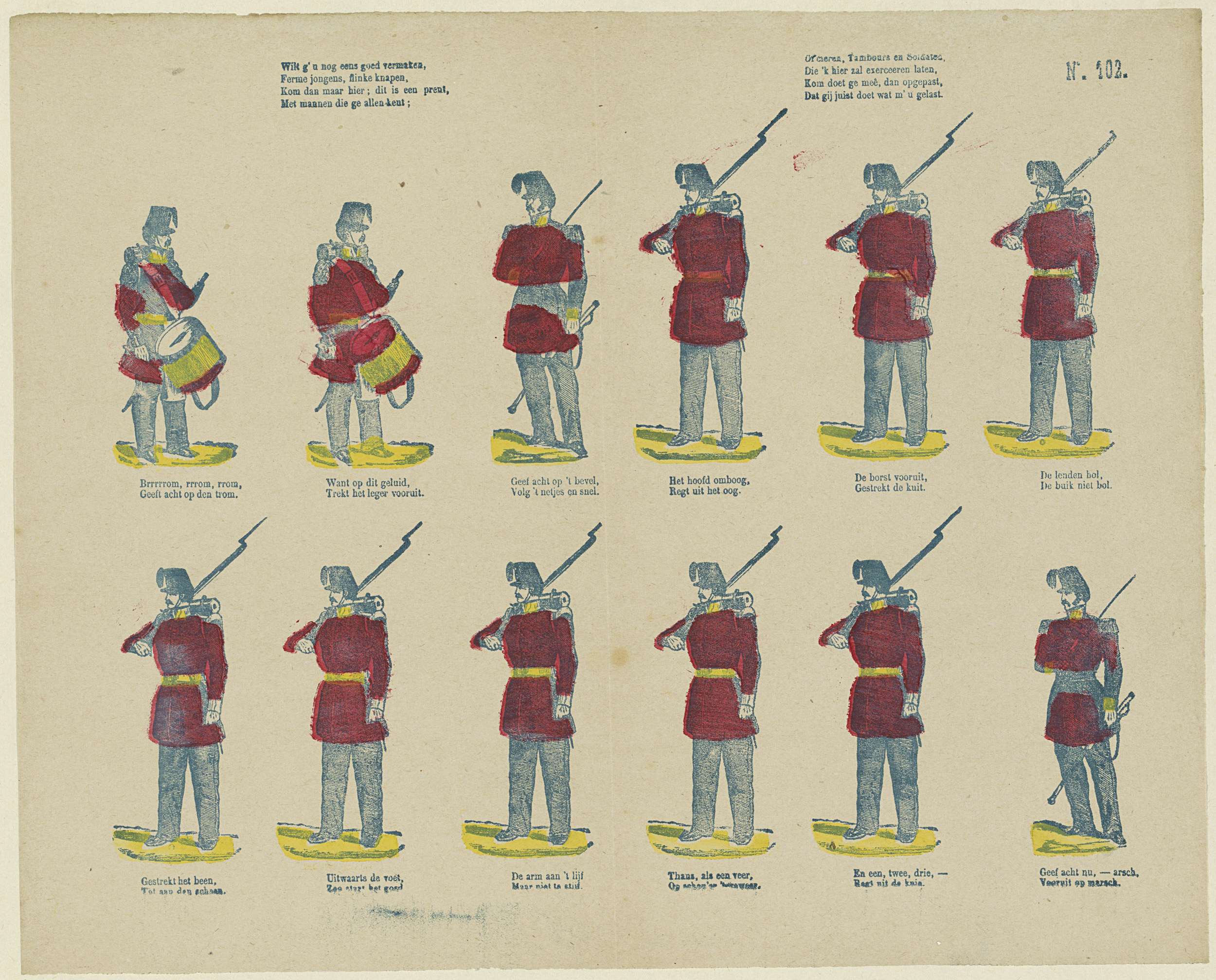 Blad met 12 voorstellingen van militairen. Onder elke afbeelding een tweeregelig vers. Genummerd rechtsboven: No. 102.