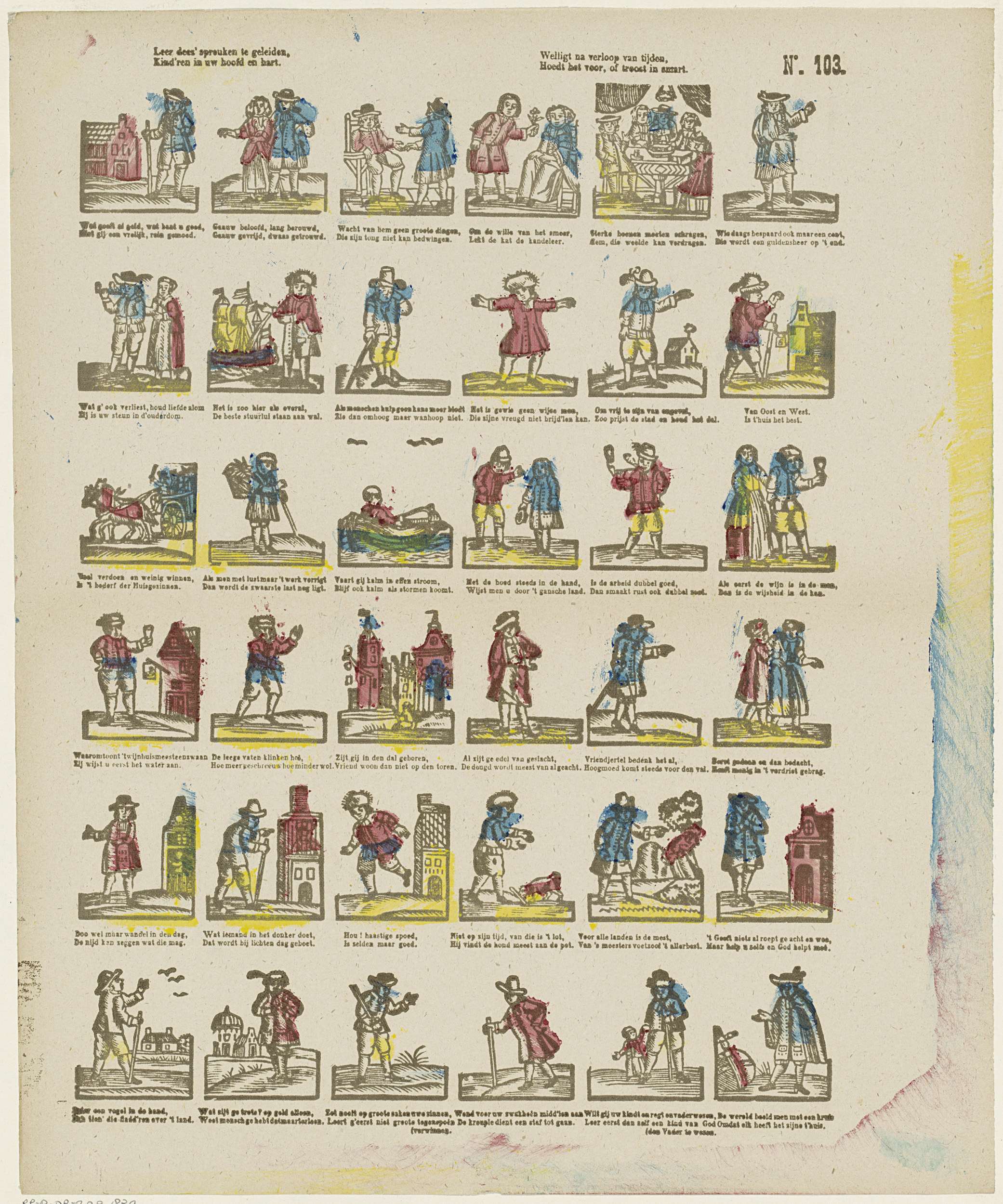 Blad met 36 verbeeldingen van spreekwoorden en gezegden. Onder elke afbeelding een tweeregelig vers. Genummerd rechtsboven: No. 103.