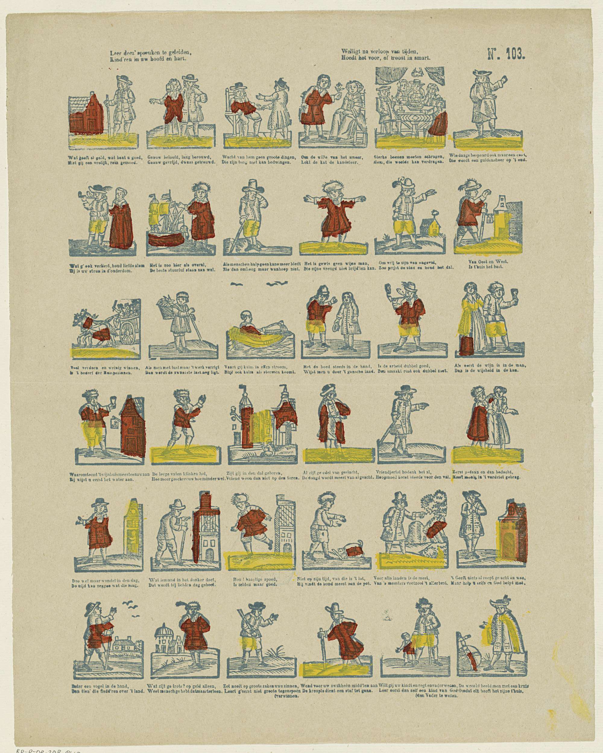Blad met 36 verbeeldingen van spreekwoorden en gezegden. Onder elke afbeelding een tweeregelig vers. Genummerd rechtsboven: No. 103.