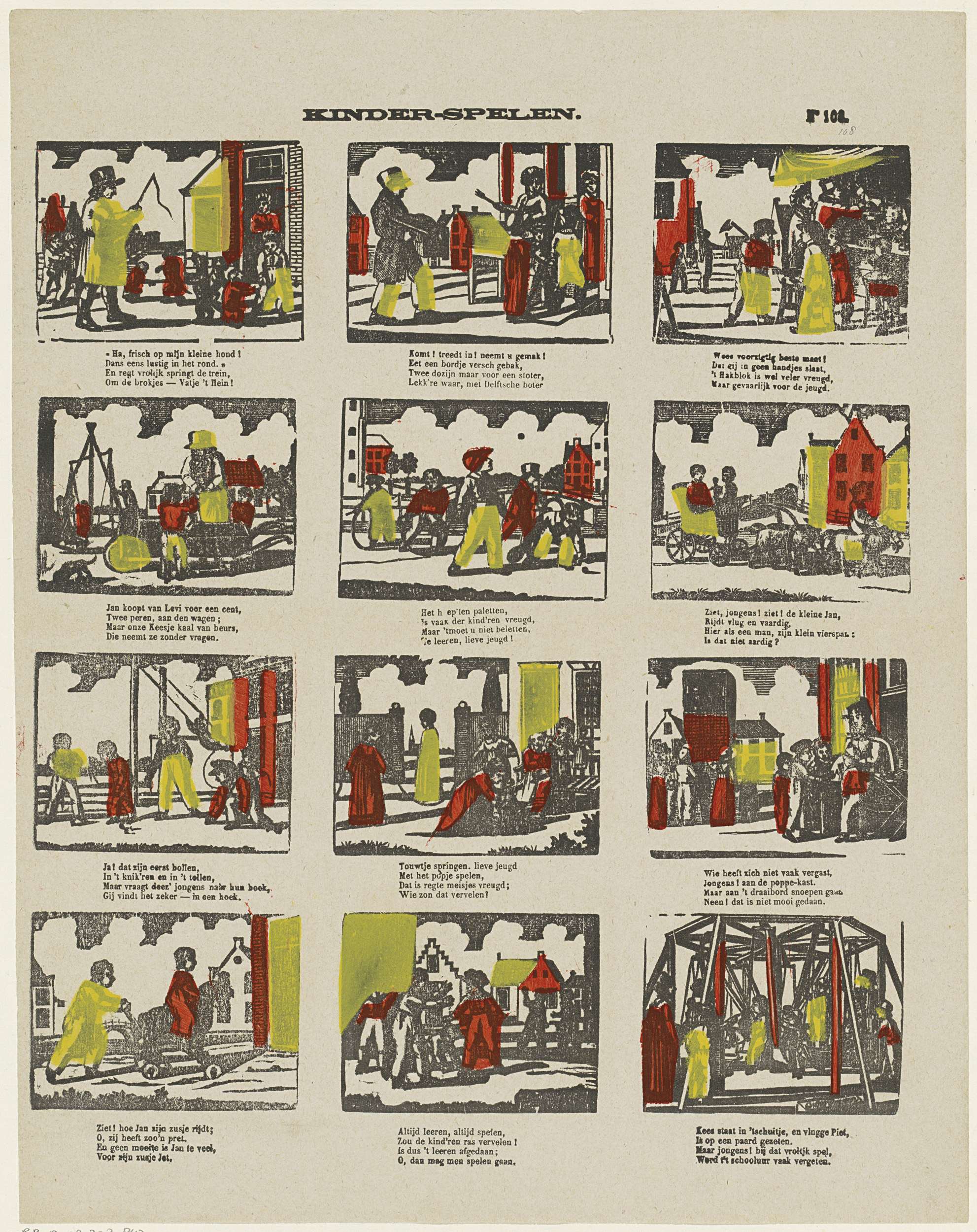 Blad met 12 voorstellingen van kinderspelen en bezigheden, zoals touwtjespringen en hoepelen. Onder elke afbeelding een vierregelig vers. Genummerd rechtsboven: No. 108.
