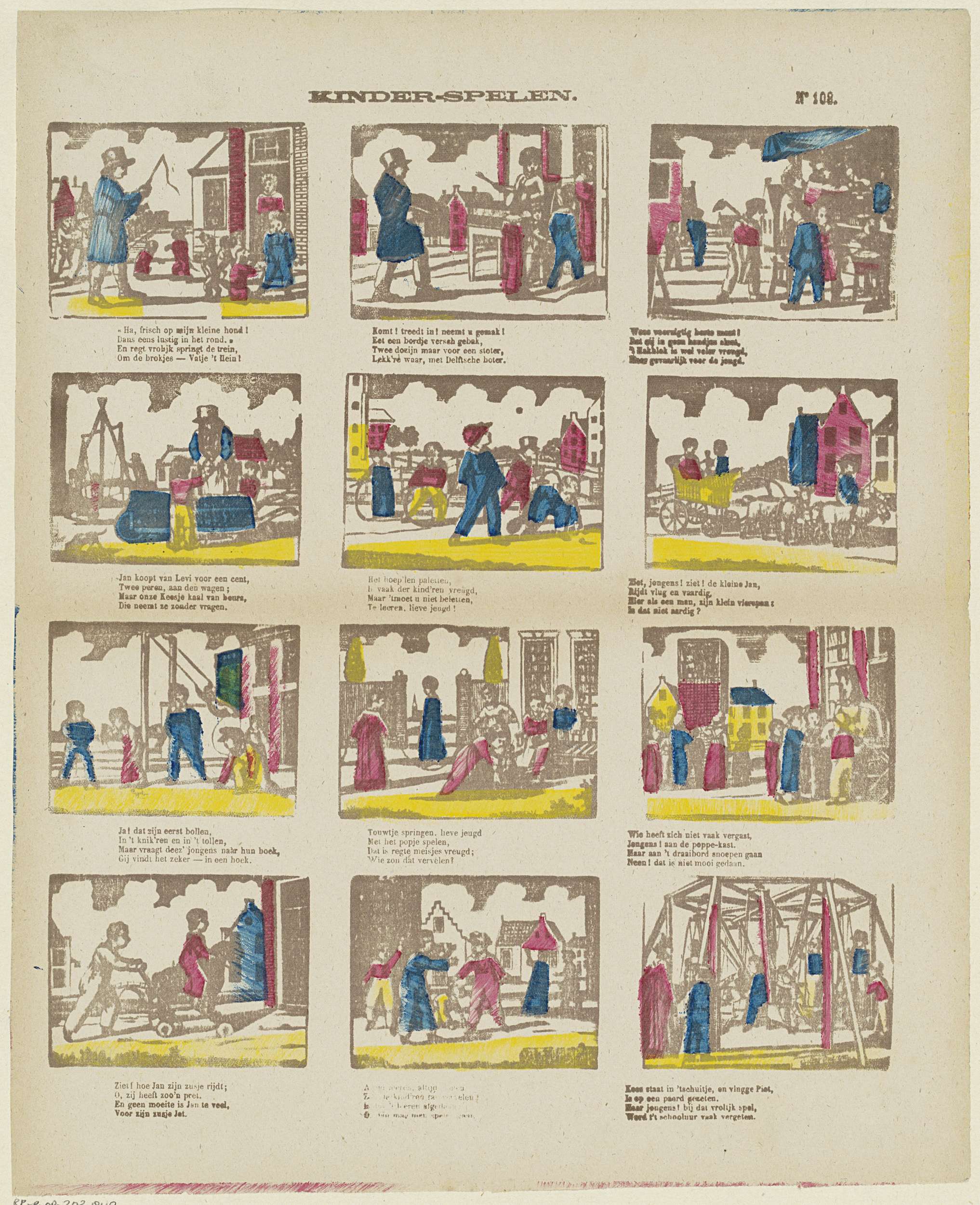 Blad met 12 voorstellingen van kinderspelen en bezigheden, zoals touwtjespringen en hoepelen. Onder elke afbeelding een vierregelig vers. Genummerd rechtsboven: No. 108.