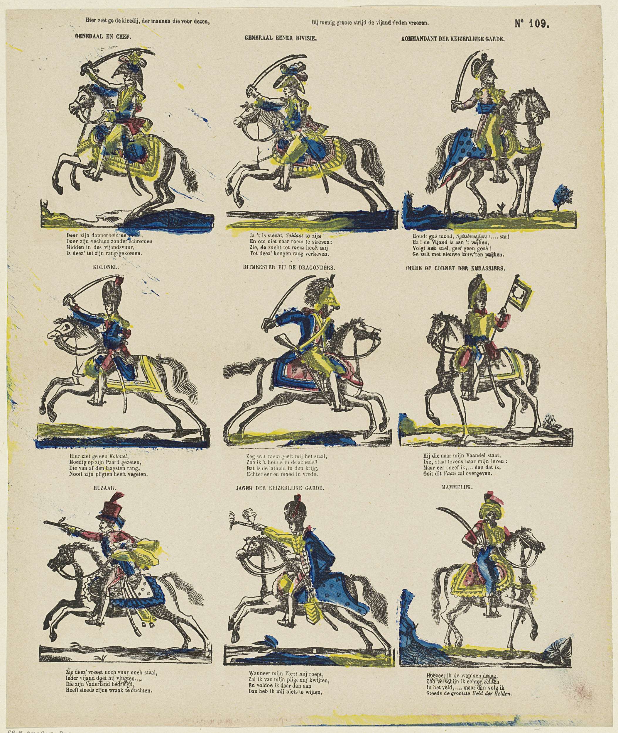 Blad met 9 voorstellingen van militairen te paard. Onder elke afbeelding een vierregelig vers, boven elke afbeelding een titel. Genummerd rechtsboven: No. 109.