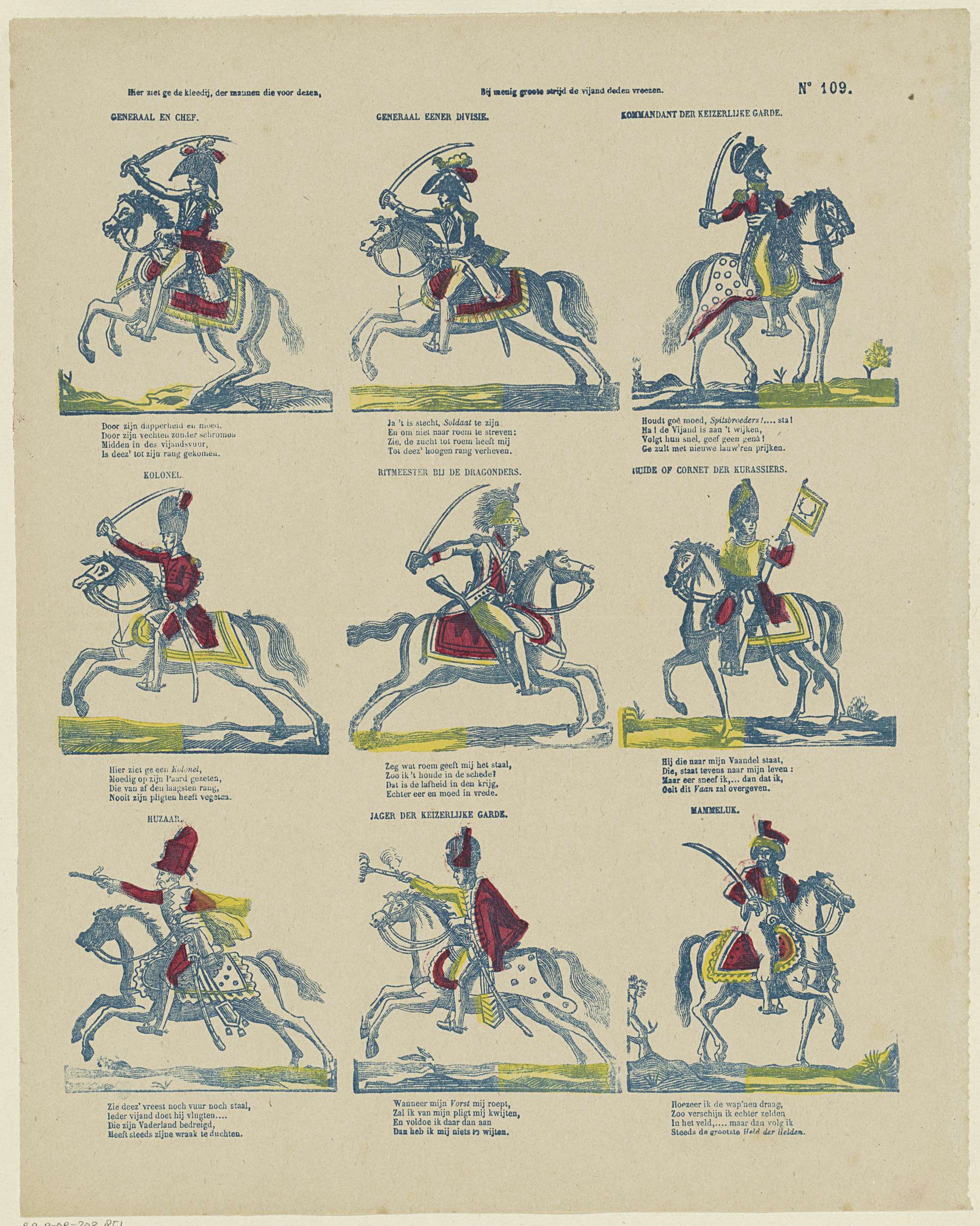 Blad met 9 voorstellingen van militairen te paard. Onder elke afbeelding een vierregelig vers, boven elke afbeelding een titel. Genummerd rechtsboven: No. 109.