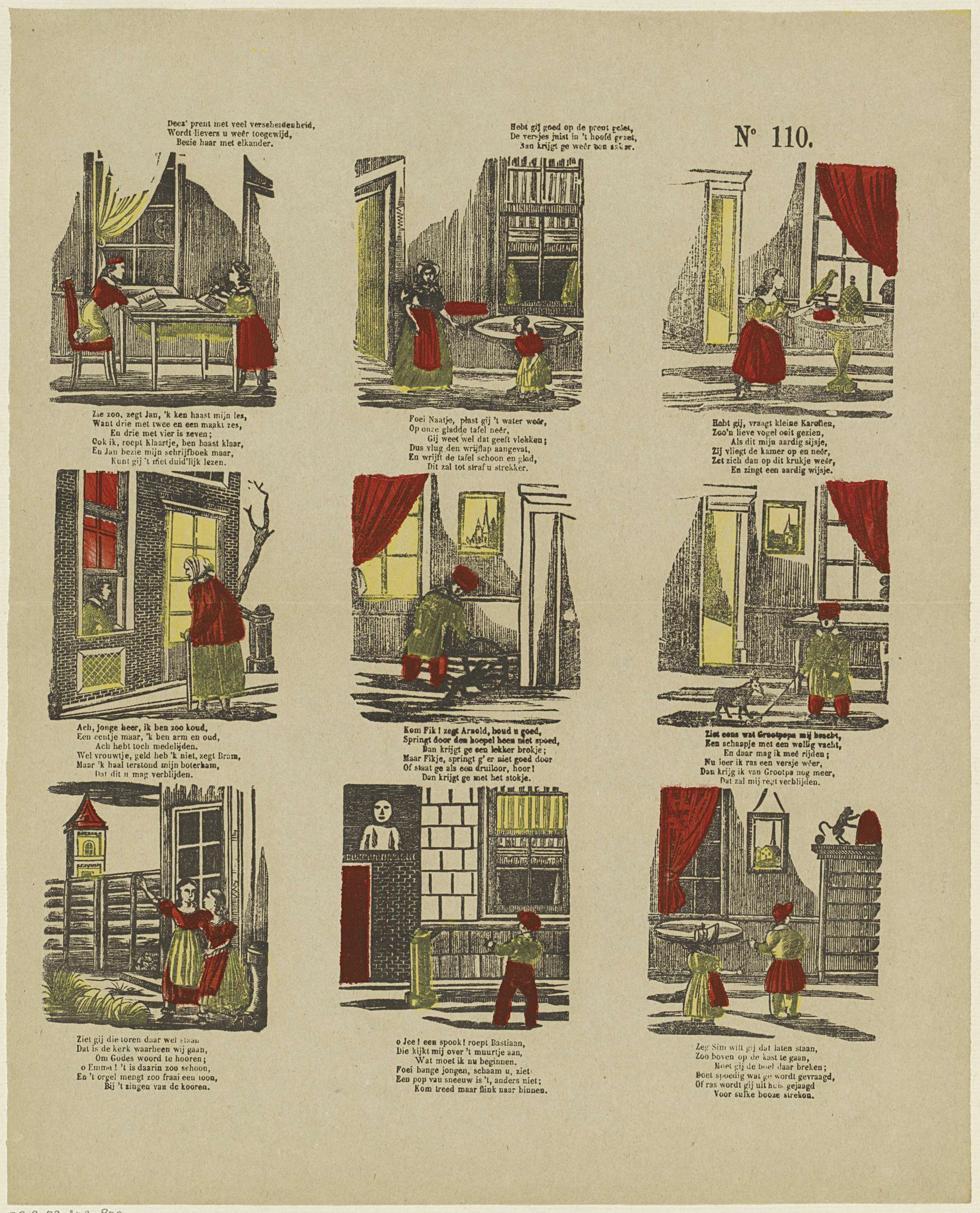 Blad met 9 voorstellingen van bezigheden voor kinderen, zoals studeren, met een vogel spelen en hoepelen. Onder elke afbeelding een zesregelig vers. Genummerd rechtsboven: No. 110.
