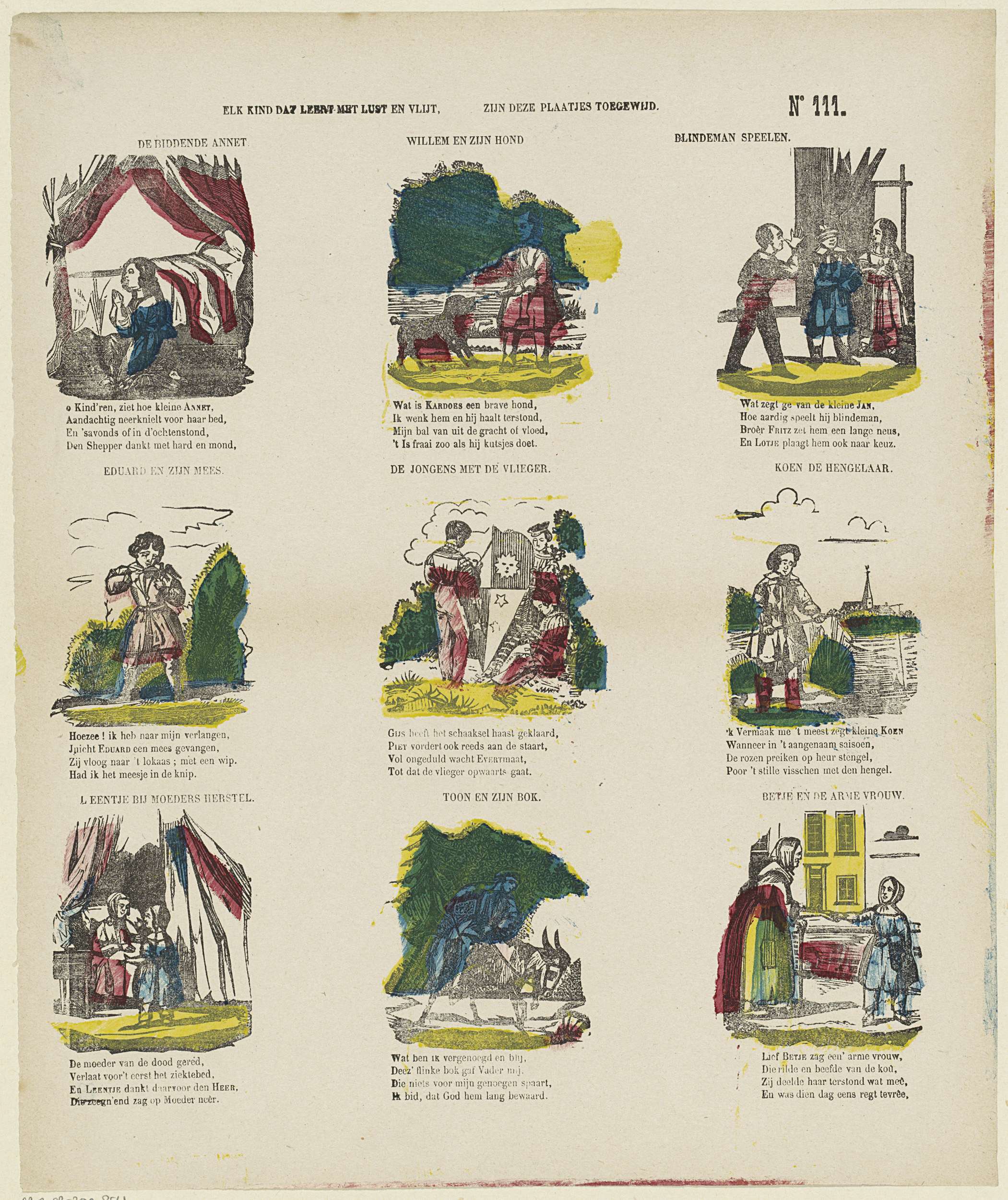 Blad met 9 voorstellingen van bezigheden voor kinderen, zoals bidden, blindemannetje en vissen. Onder elke afbeelding een vierregelig vers, boven elke afbeelding een titel. Genummerd rechtsboven: No. 111.