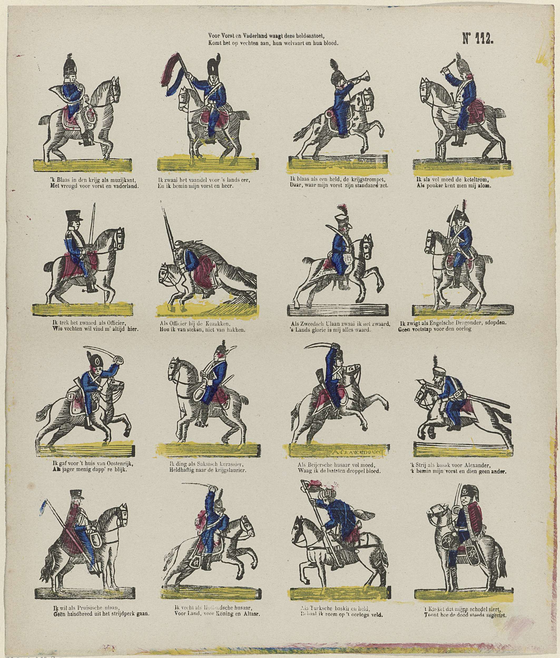 Blad met 16 voorstellingen van militairen te paard. Onder elke afbeelding een tweeregelig vers. Genummerd rechtsboven: No. 112.