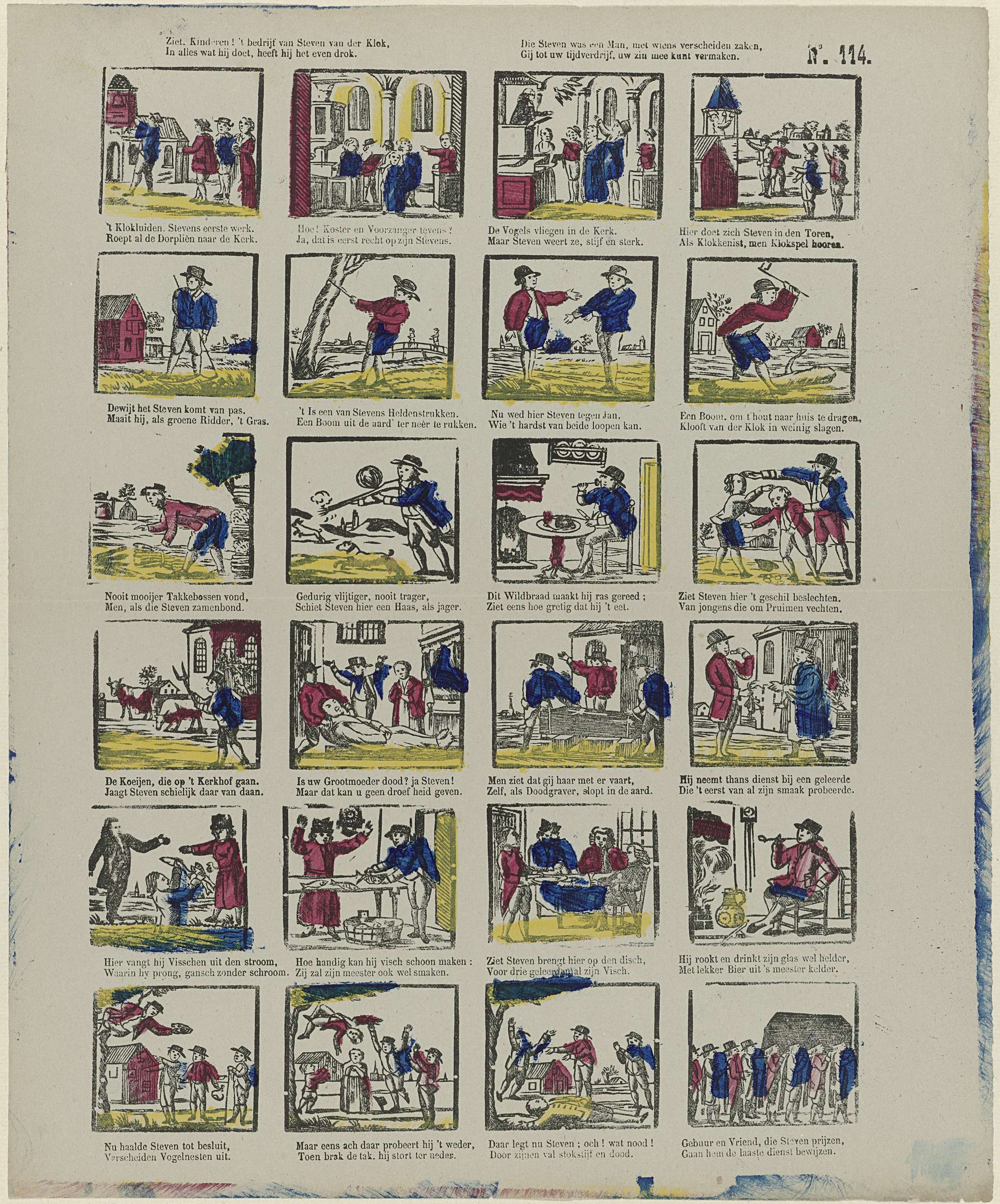 Blad met 24 voorstellingen over het leven van Steven van der Klok. Onder elke afbeelding een tweeregelig vers. Genummerd rechtsboven: No. 114.