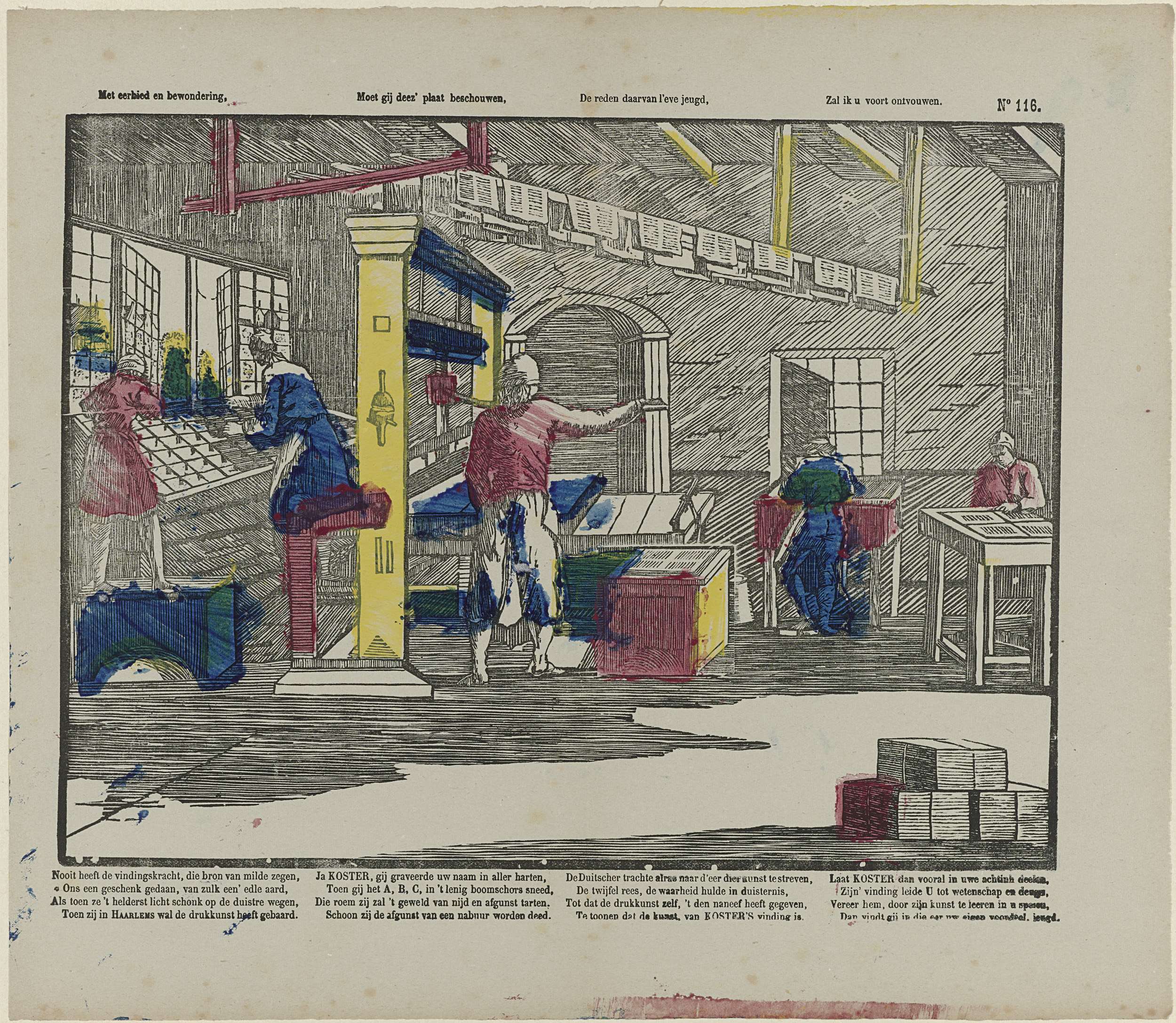 Blad met een grote voorstellingen van een drukkerij (mogelijk die van Laurens Jansz. Coster). Links twee mannen bij letterbakken, centraal een man die de drukpers bedient en rechts twee mannen die gedrukte vellen staan te redigeren. Boven hangen pas gedrukte bladen over balken te drogen. In de ondermarge een onderschrift in vier kolommen. Genummerd rechtsboven: ...