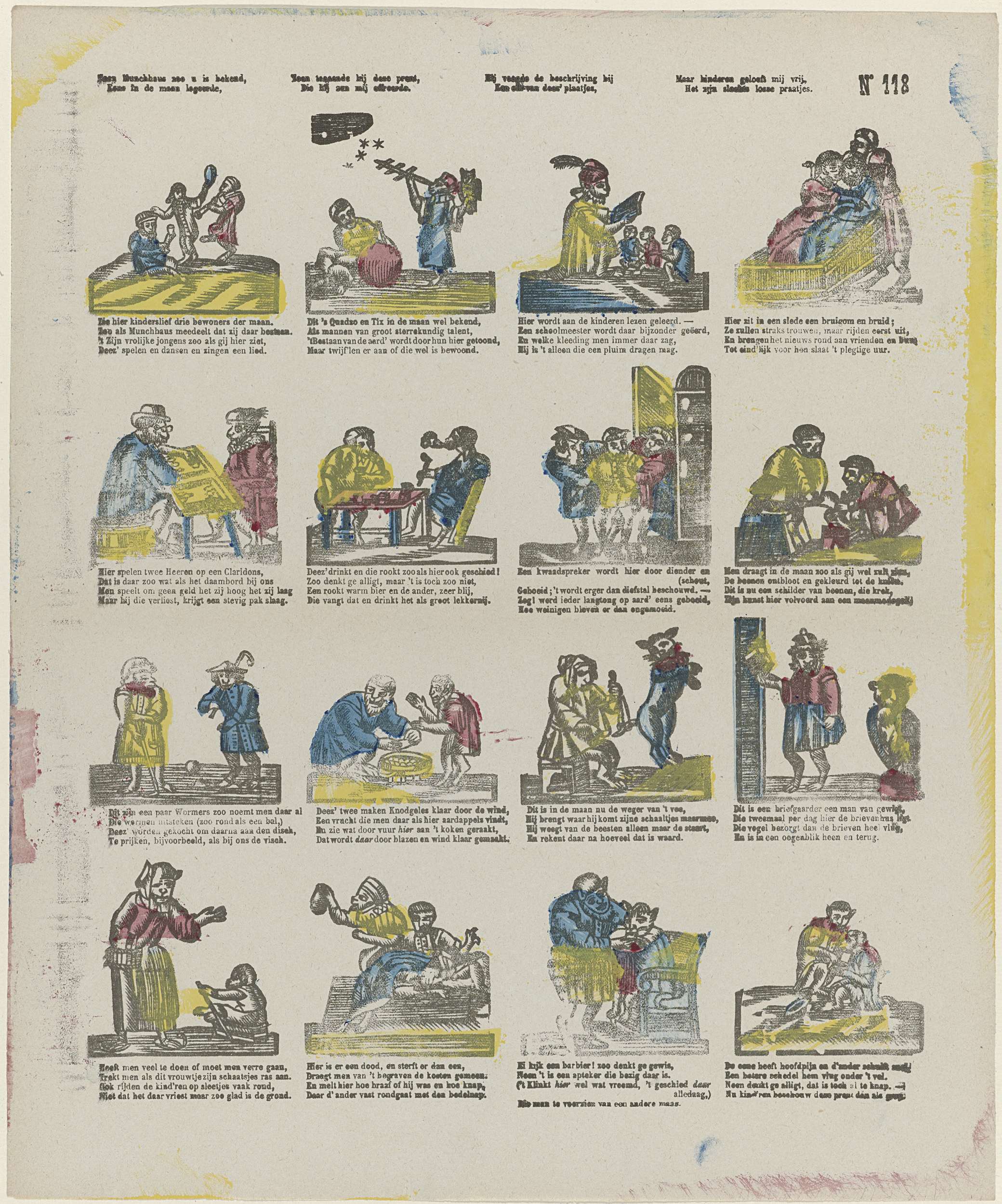 Blad met 16 voorstellingen van apen op de maan, die zich als mensen gedragen. Onder elke afbeelding een vierregelig vers. Genummerd rechtsboven: No 118.