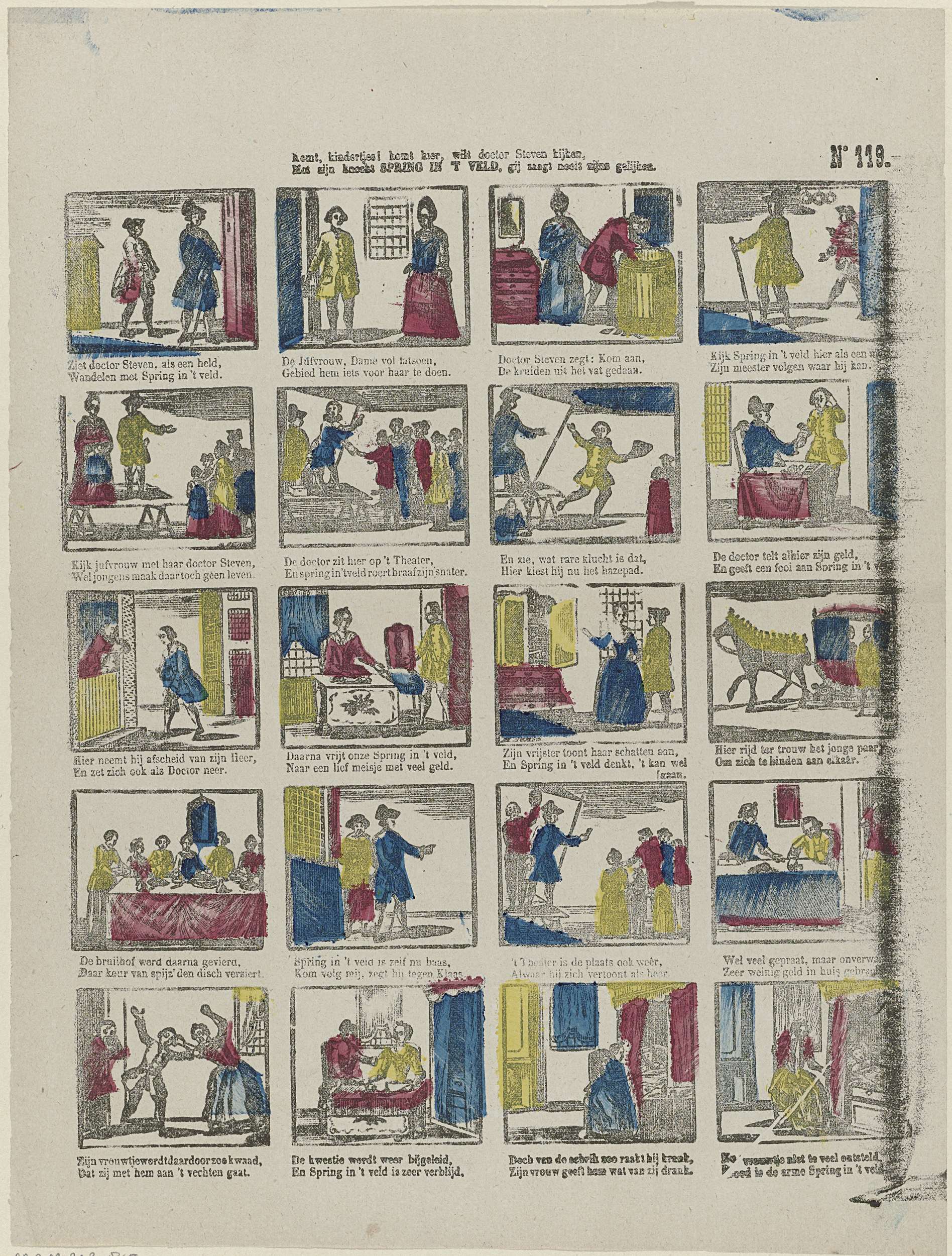 Blad met 20 voorstellingen over het leven van de kwakzalver dr. Steeven en zijn knecht Spring in 't Veld. Onder elke afbeelding een tweeregelig vers. Genummerd rechtsboven: No 119.
