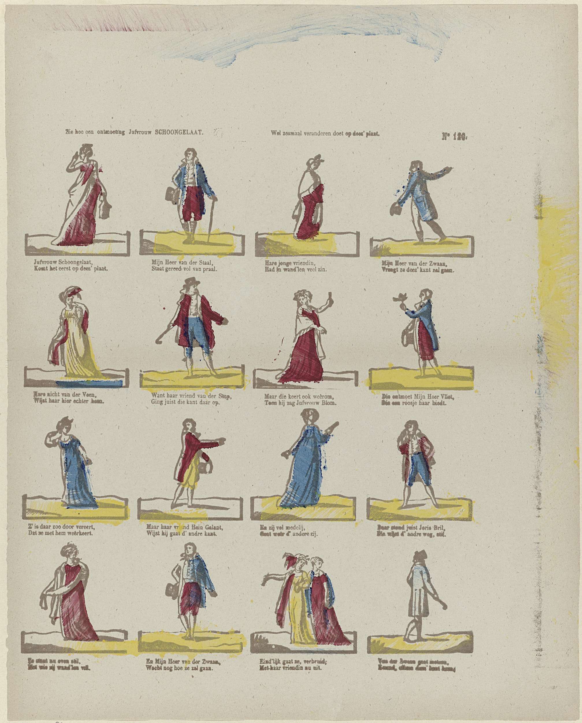 Blad met 16 voorstellingen van verschillende figuren. Onder elke afbeelding een tweeregelig vers. Genummerd rechtsboven: No 120.